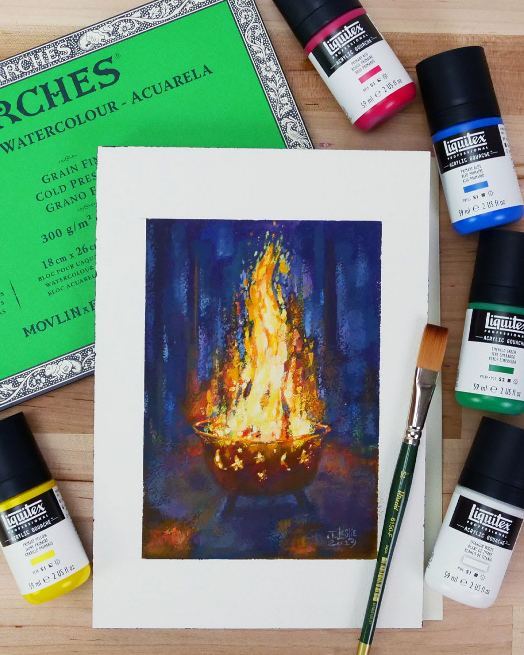 Process 2. Vertical Format Layout • Using the 7” x 10” Arches watercolor paper block in a vertical format, measure in 1” on each and lightly mark with a pencil for a 5” width. • Measure 1.5” from top and bottom and mark lightly with a pencil for a 7” length. • Apply painter’s tape and burnish the edges. 3. The initial stage of drawing should be simple with basic geometric shapes and the concept of working “general to specific” at each stage of the painting. Keep lines light. 4. Begin blocking in colors quickly to establish relationships rather than finishing one area and then moving to the next. This section of the “sky” or background helps establish the shape of the flame but is quickly laid in, in 3 minutes or so using a mix of mostly Primary Blue, a bit of Primary Red and a little Mars black to create a deep gray/purple. The entire surface should be covered with color in 10 to 15 minutes. 5. For the flame, use Primary Red with a small amount of Primary Yellow. To achieve the brown color of the wood, add a bit of Emerald Green. 6. The remaining sections are blocked in with roughly a 50/50 mixture of Primary Red and Emerald Green for the ground with a bit more Primary Red and Primary Yellow added to the mixture for the fire pit.