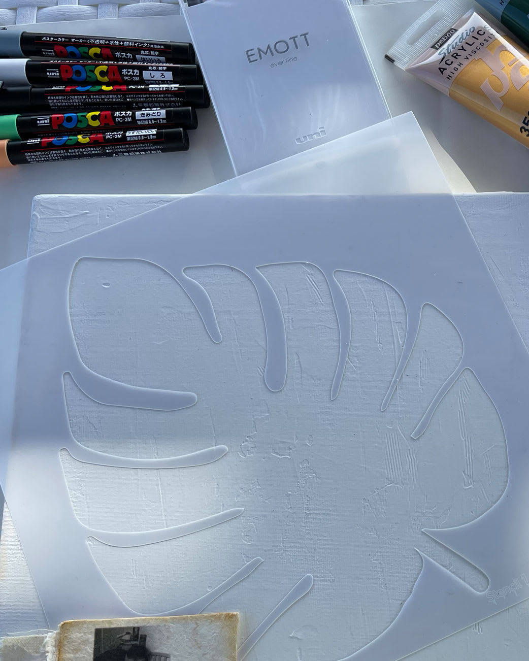Stencil us in! Create a large monstera leaf silhouette on canvas then add patterns with inks, paint, pencils, pens, and modeling paste.