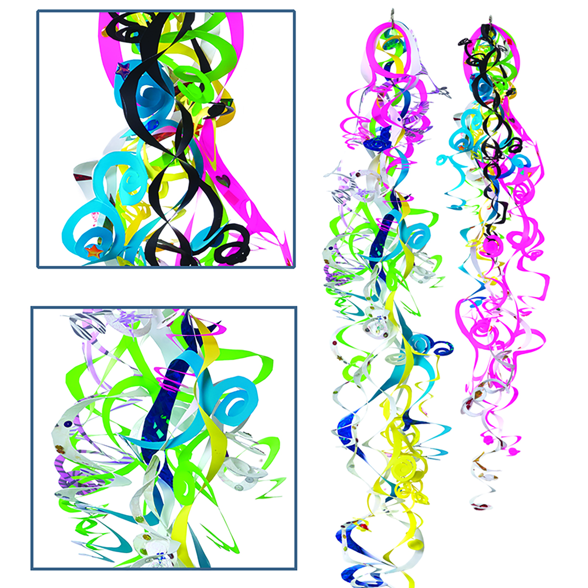 Whimsical, colorful, and much easier than one would expect, these paper creations make festive decorations for mere pennies. A simple spiral cut — a line that starts on the edge of a circle and continues to the center — is the only skill needed. No glue, no extra construction. The secret is starting with multiple conjoined circles.
