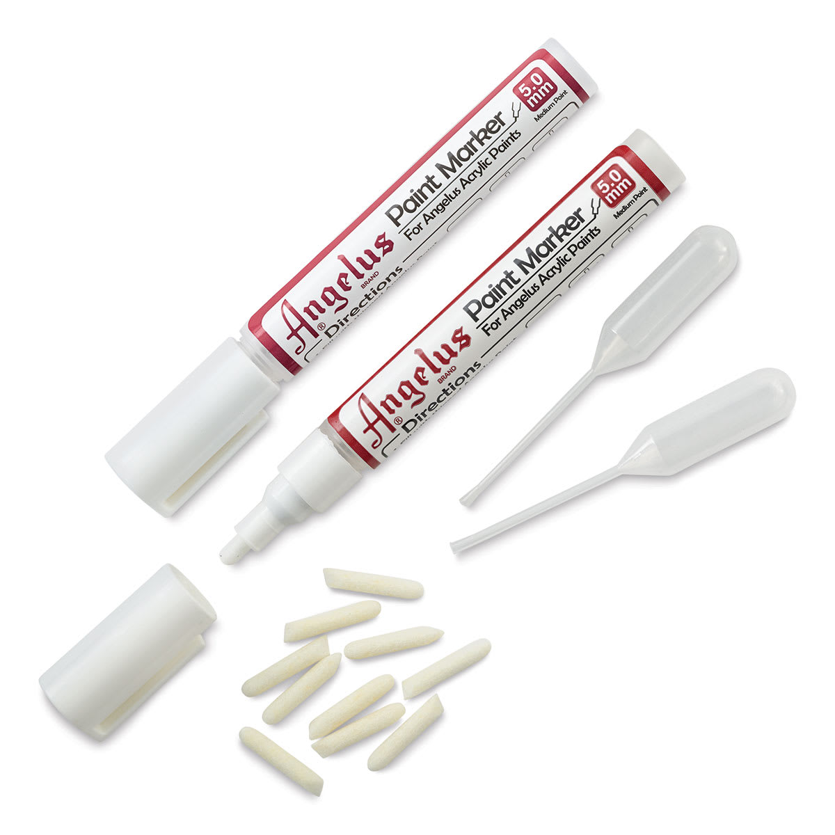 This 14-piece 5mm tip set includes two Angelus Empty Paint Markers, 10 dual-sided replacement tips, and two eyedroppers.