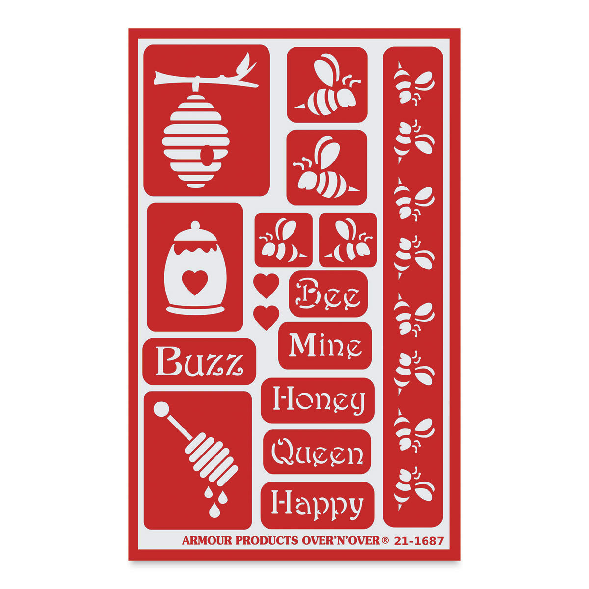 8"H x 5"W (20.3 cm x 12.7 cm) sheet contains an assortment of bee words and shapes. Large Bees: 1"H x 1"W Small Bees: 3/4"H x 3/4"W Beehive: 2"H x 1-1/2"W Words: 1/2" high Bee Border: 3/4"H x 7"W Sizes are approximate.
