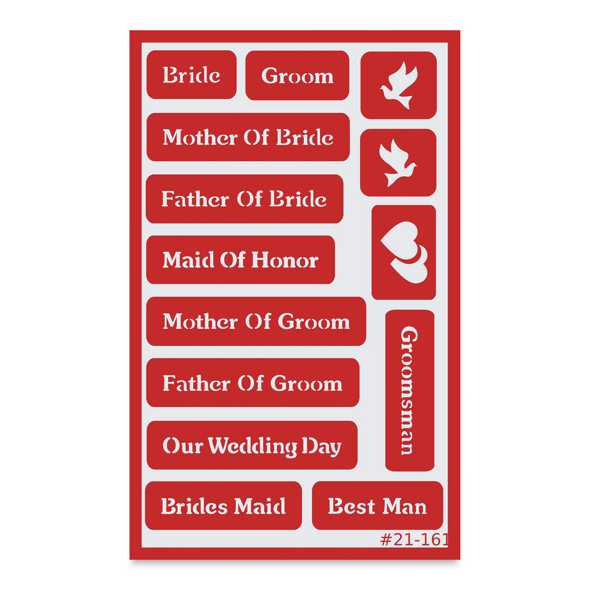 8"H x 5"W (20.3 cm x 12.7 cm) sheet contains titles of wedding party members plus doves and hearts. Capital letters are 1/4" high. Lowercase letters vary.