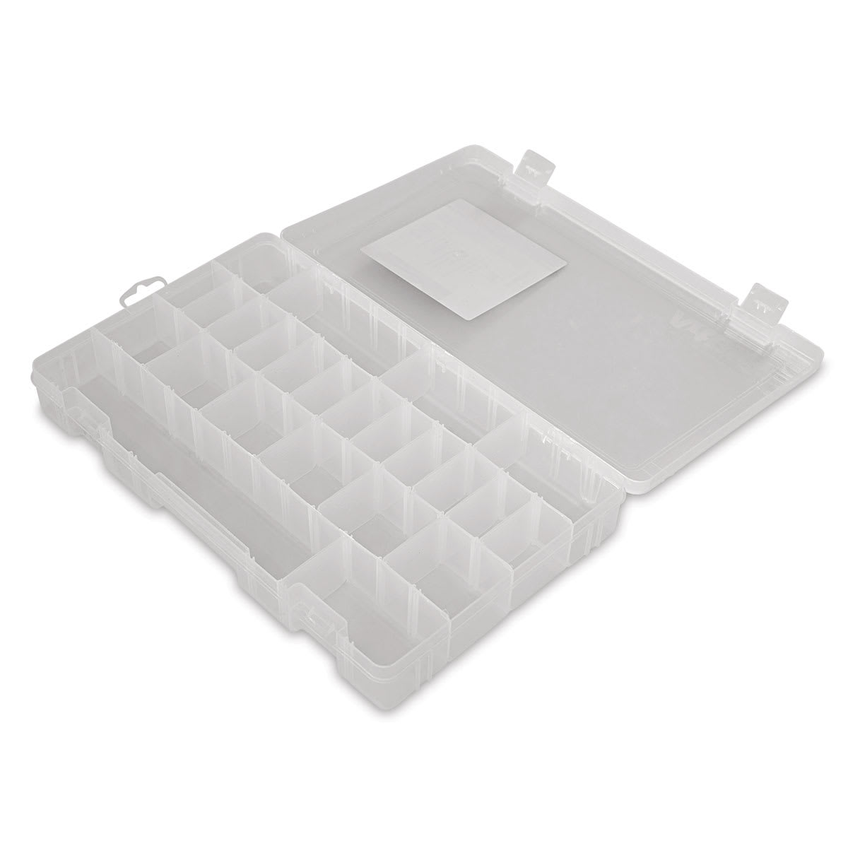 This box has four fixed compartments and 20 removable dividers for customizing. Measures 14-1/8" × 9" × 2".