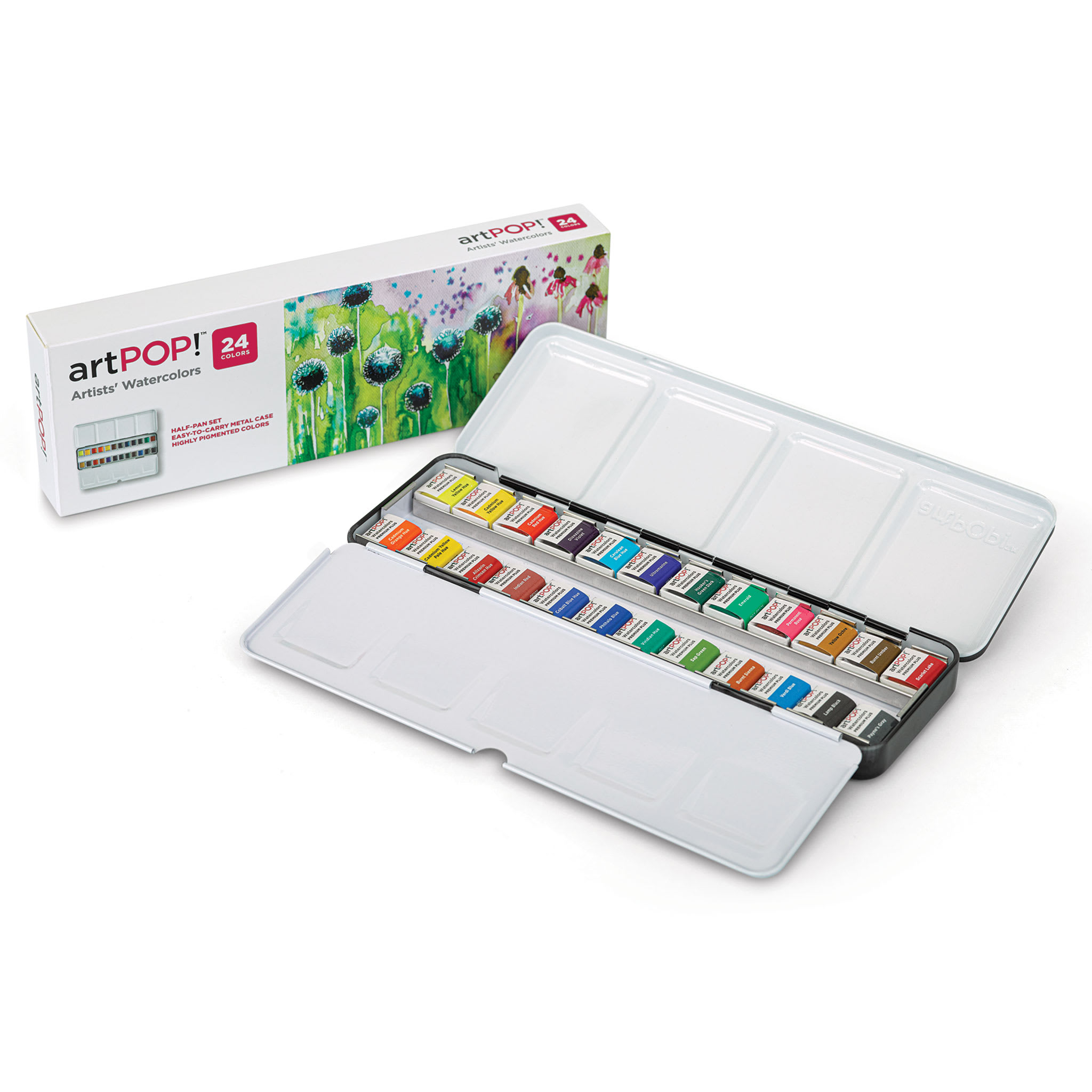Includes 24 half pans in Lemon Yellow Hue, Cadmium Yellow Hue, Cadmium Red Hue, Scarlet Lake, Permanent Rose, Dioxazine Violet, Cerulean Blue Hue, Ultramarine, Emerald, Hooker's Green Dark, Yellow Ochre, Burnt Umber, Cadmium Yellow Pale Hue, Cadmium Orange Hue, Alizarin Crimson Hue, Cobalt Blue Hue, Verdi Blue, Phthalo Blue, Viridian Hue, Sap Green, Burnt Sienna, Indian Red, Payne's Gray, and Lamp Black in a durable metal carrying case.