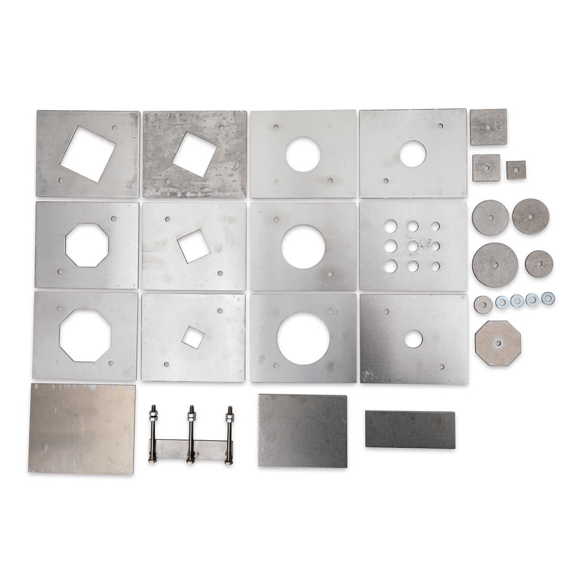 This is an excellent selection of small- and medium-sized dies for use with the Bailey Clay Extruder. Each die extrudes clay easily from the 4" barrels. Clay forms 2" and larger will extrude easily from the 5" barrel. Smaller clay forms may be difficult to extrude depending on the type of clay being used. Bailey Clay Extruder dies are cut from 5" × 6" aluminum plates. The kit includes the following materials:3 Square tubes (1-1/2", 2", 2-1/2")4 Round tubes (1-1/2", 2", 2-1/2", 3")2 Octagon tubes (2-1/2", 3")1, 1" Square coil (solid)1, 1" Round coil (solid)9 Coil dies (three each 1/4", 5/8", and 1/2")1 Adjustable slab die (cannot be used with the die adapter)1 Die blank1 Standard tube brace (for use with hollow dies)