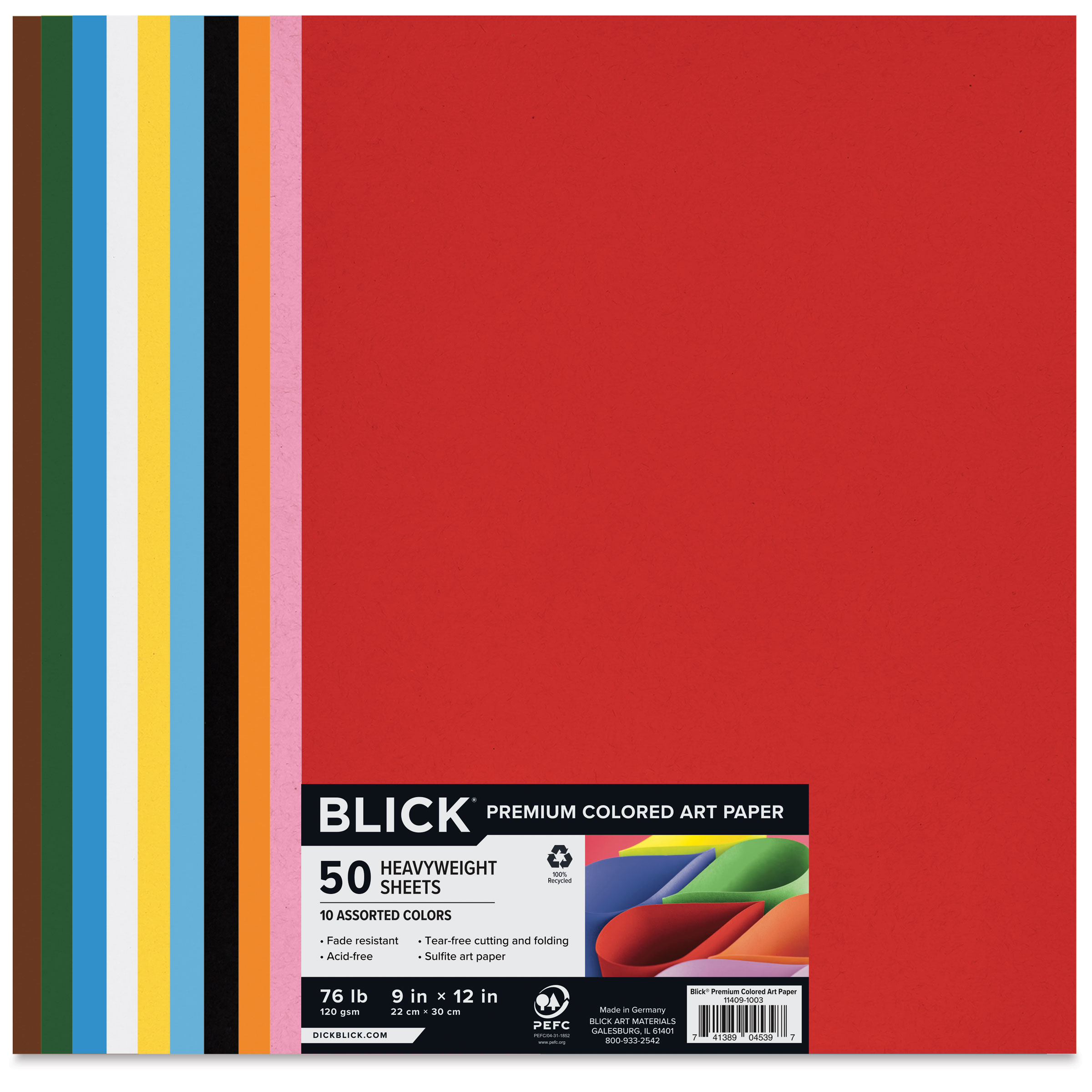 Includes 50 9" x 12" sheets, 5 each of Black, Chocolate Brown, Dark Green, Pink, Red, Sky Blue, Turquoise, Orange, White, and Yellow.