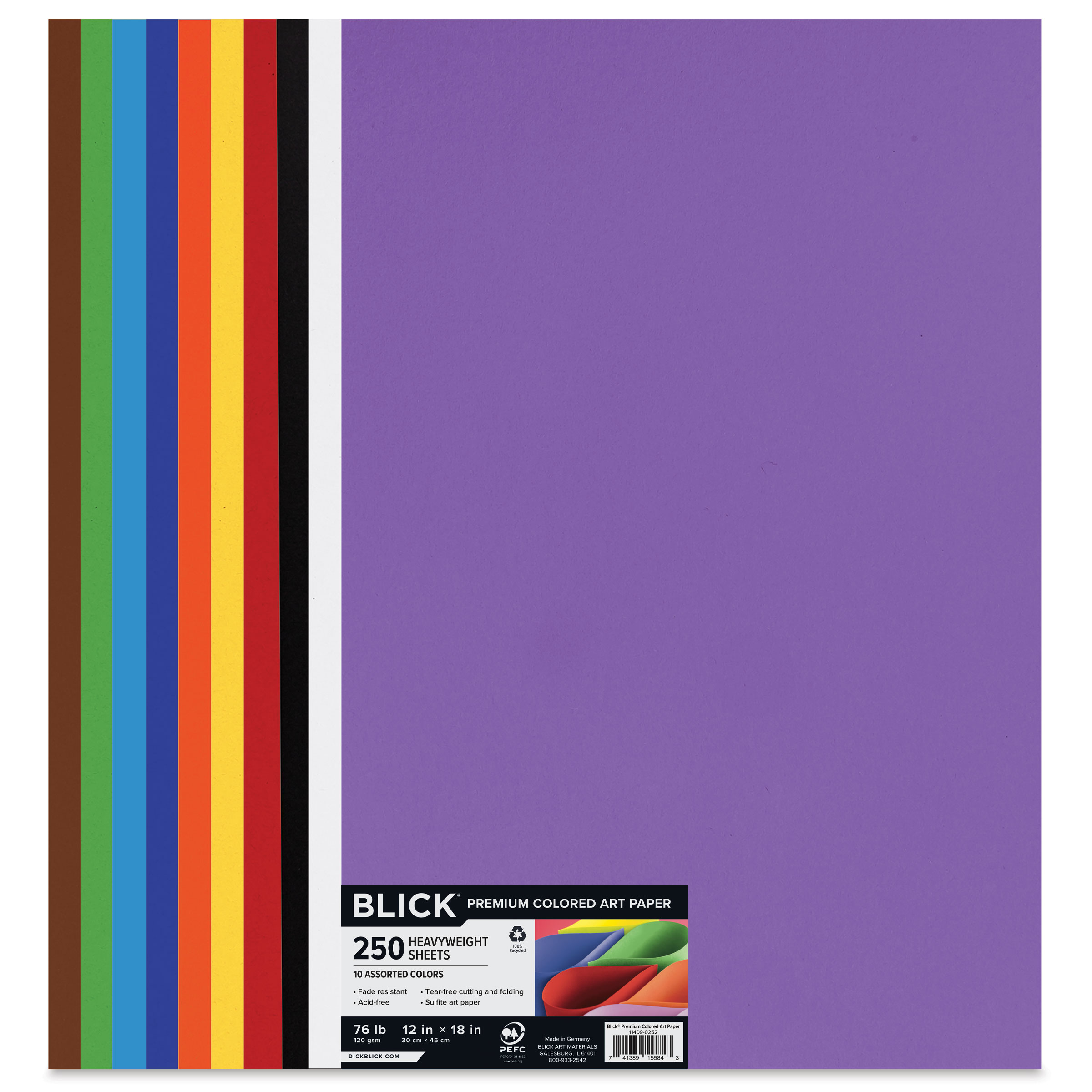 Includes 250 12" x 18" sheets, 25 each of Black, Burnt Orange, Chocolate Brown, Green, Red, Turquoise, Ultramarine Blue, Violet, White, and Yellow.