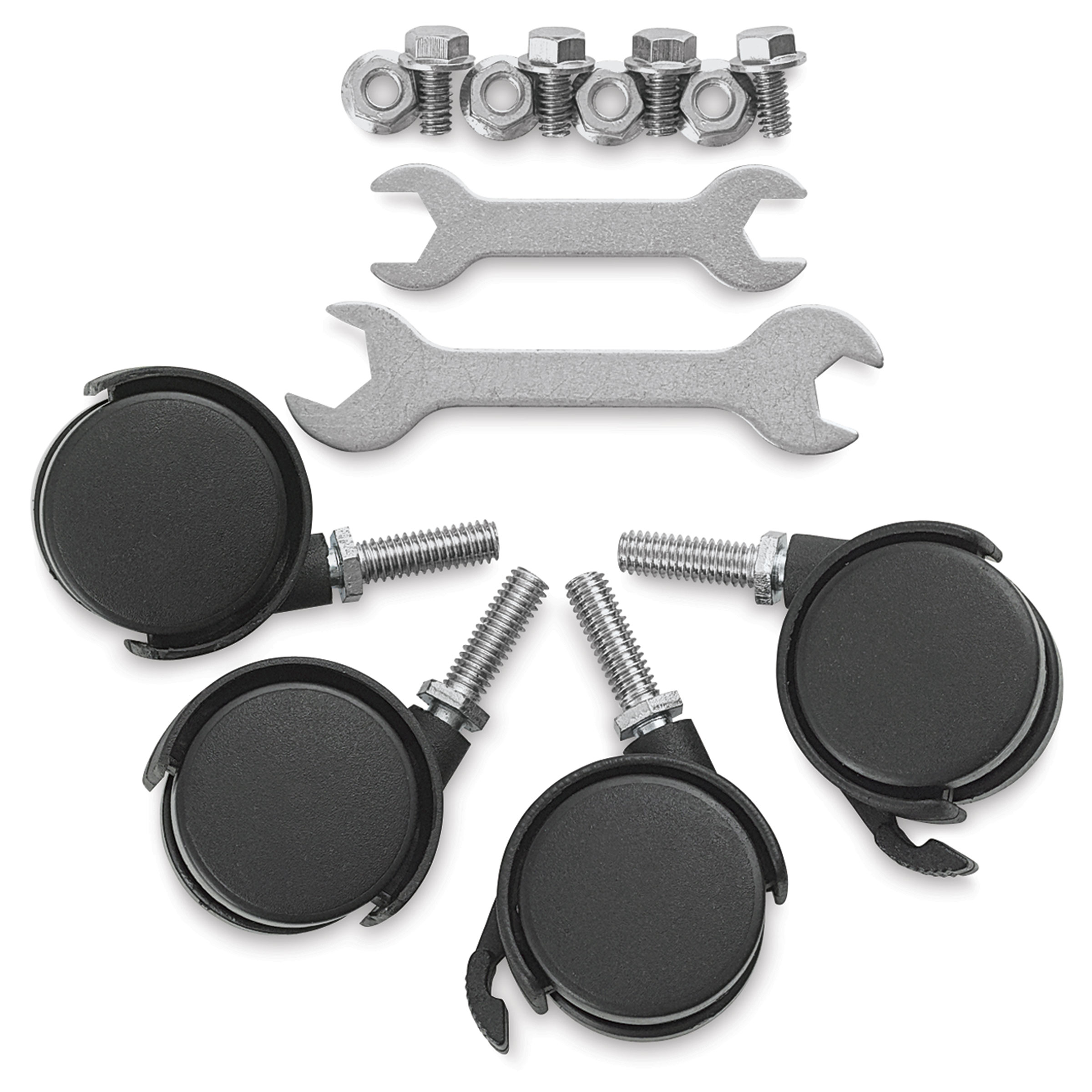 This kit contains four 3" black plastic casters — two locking casters and two non-locking casters.