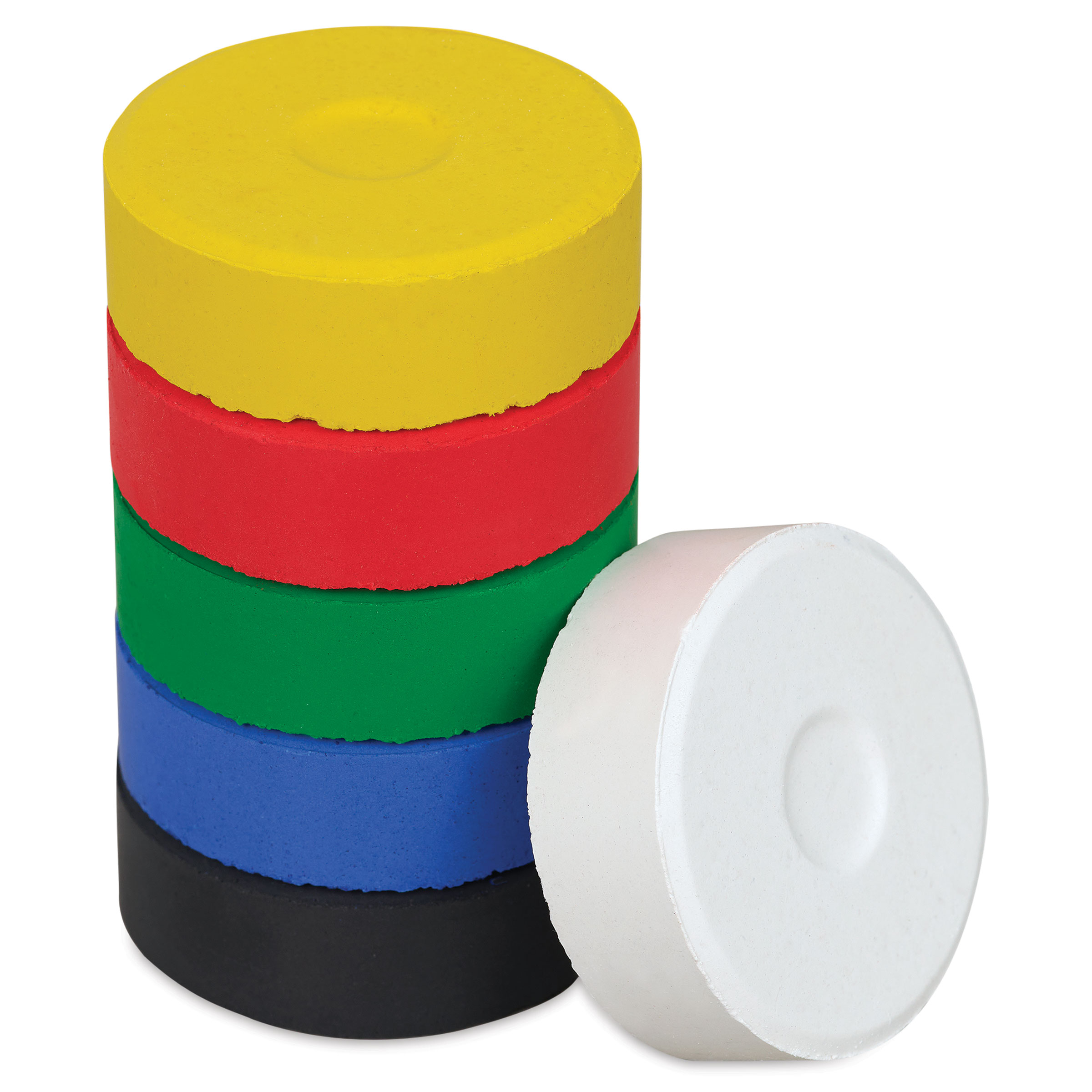 Set includes one tempera cake each of Black, Blue, Green, Red, White, and Lemon Yellow.