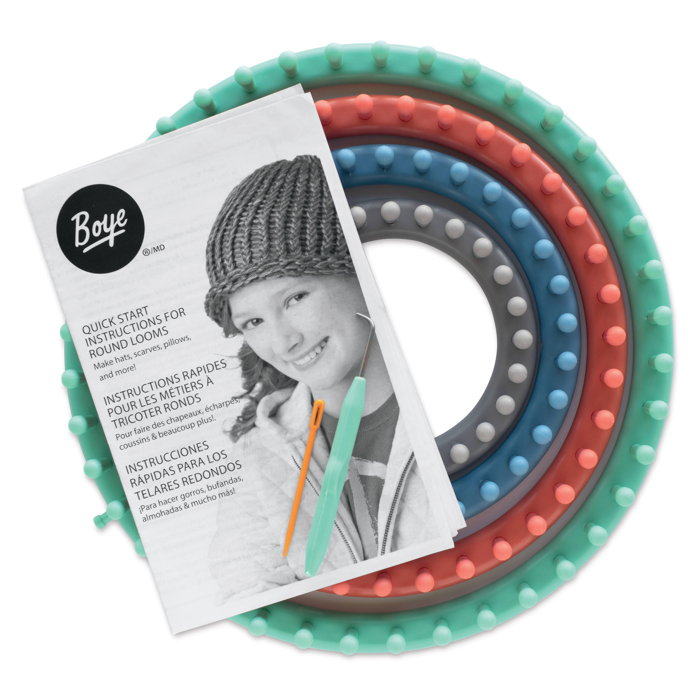 Includes four round plastic looms, one each 24-peg (5.5"), 30-peg (7.5"), 36-peg (9.5"), and 40-peg (11.5"); one loom hook; one yarn needle; and instructions.