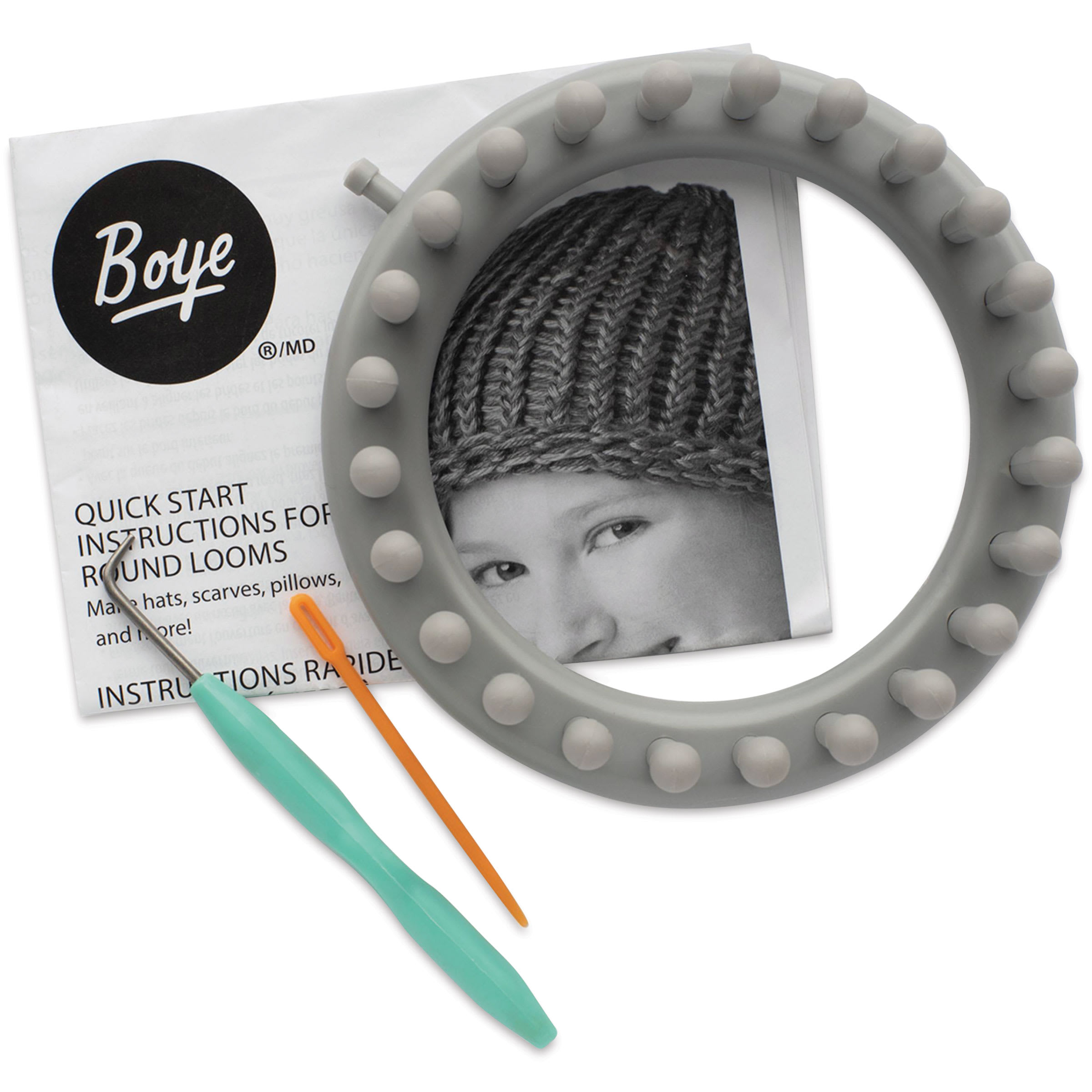 Includes one round plastic 24-peg loom (5.5") in Gray, one loom hook, one yarn needle, and instructions.
