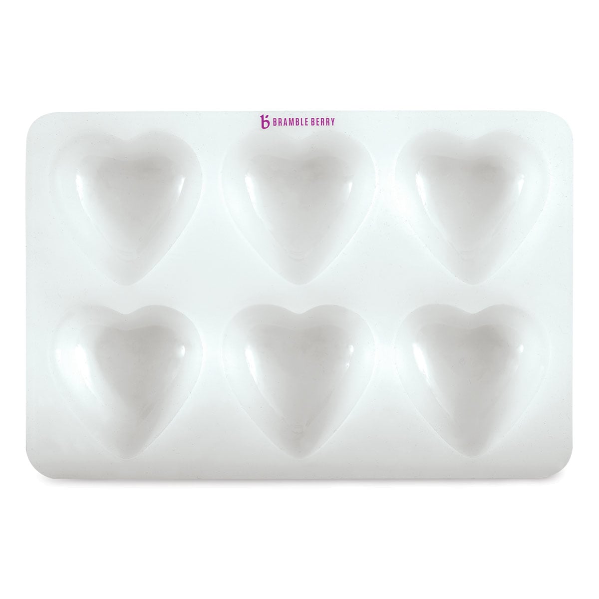 This mold measures 10-1/2"L x 7"W x 1-1/2"H and contains six heart-shaped cavities, each measuring 3"L x 3"W x 1-1/4"H.