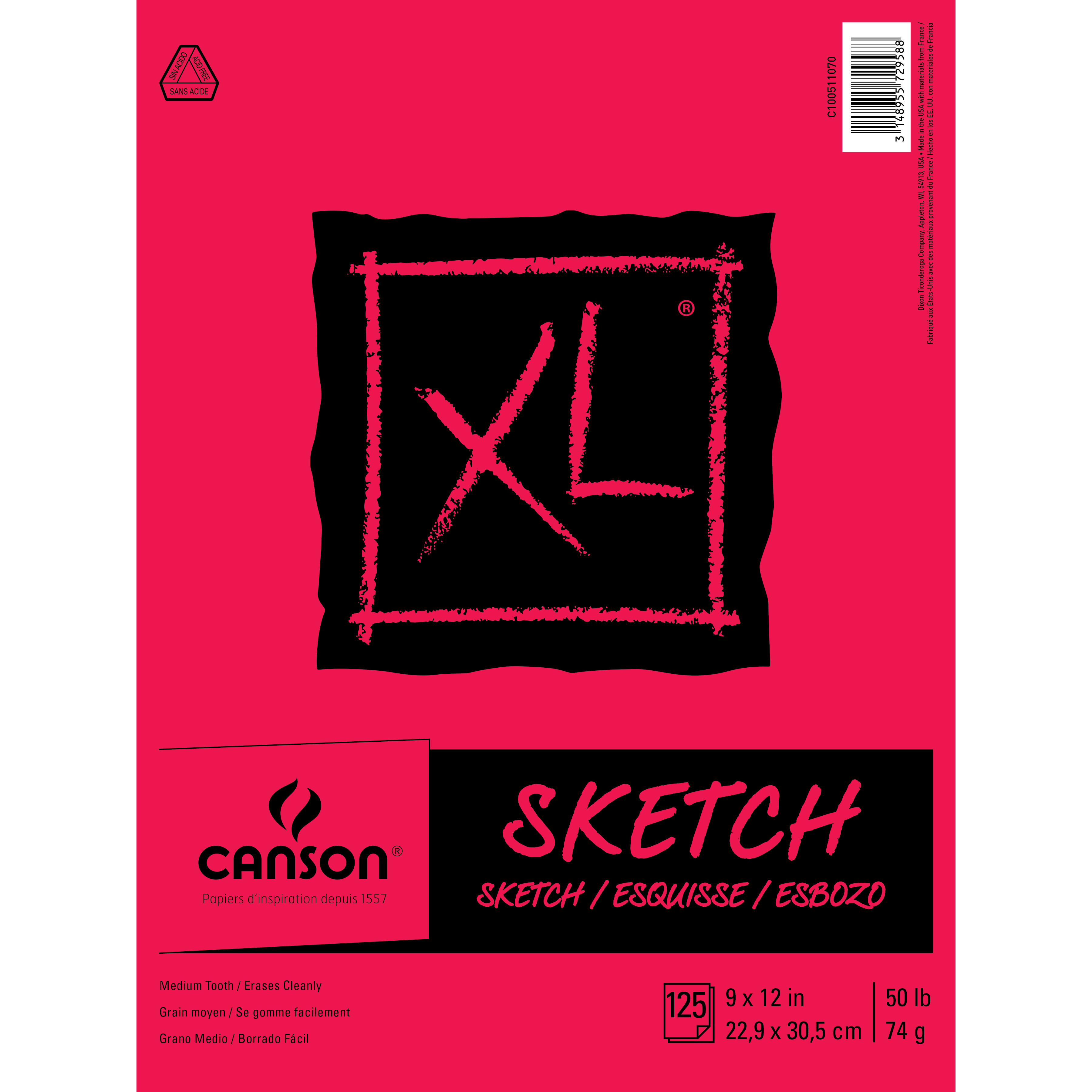 The Canson Biggie Sketch Pad contains fine-quality, bright white paper for pencil and charcoal. It's an excellent surface for a reasonable price.Tape-bound pads are bound on the short side, in a portrait format. The paper is 50 lb (74 gsm) weight, and acid-free.