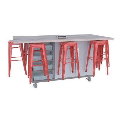 CEF Ed8 Work Table with Stools, 36"H table with red stools and Folkstone Hex finish.