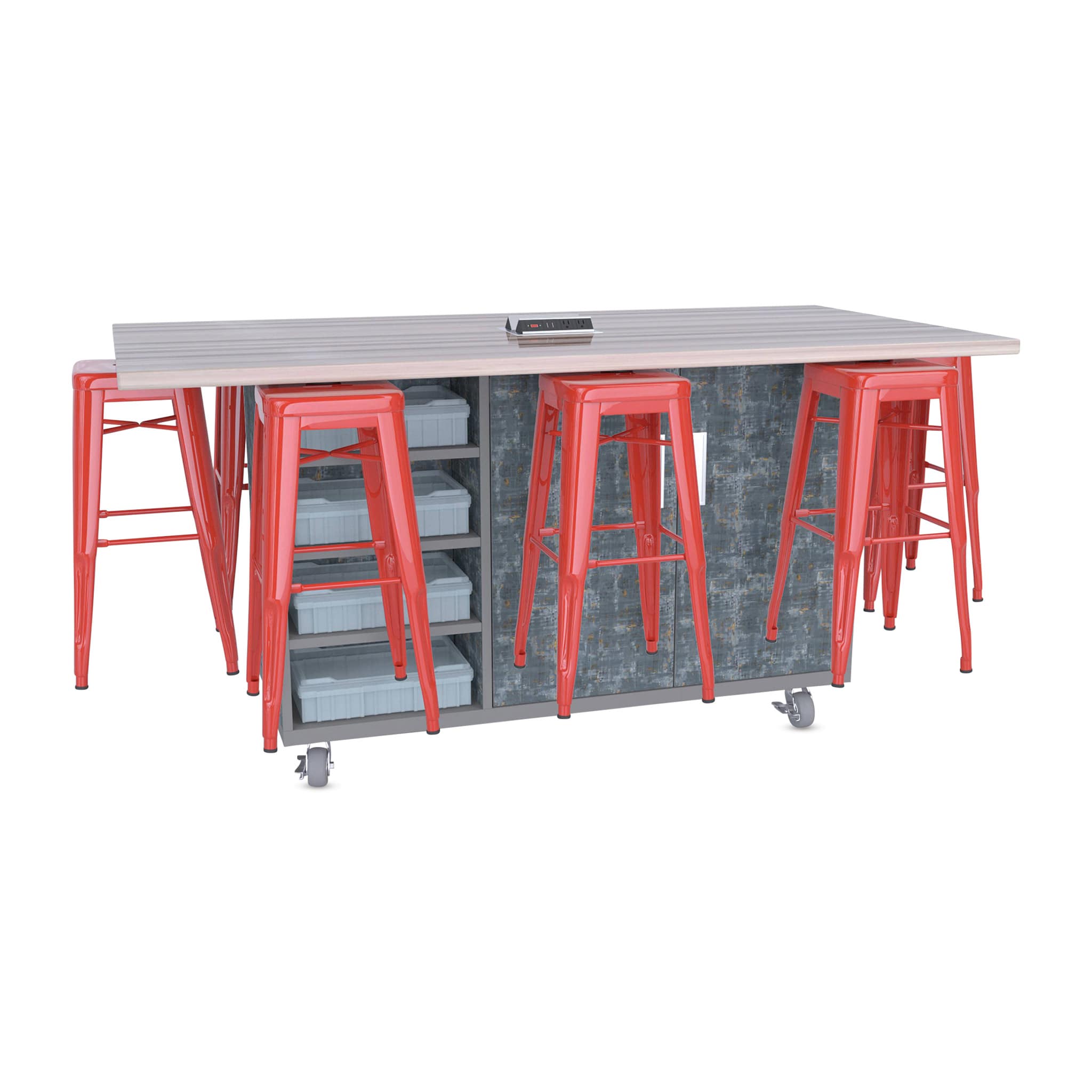 CEF Ed8 Work Table with Stools, 36"H table with red stools and Paint Scrape Steel finish.