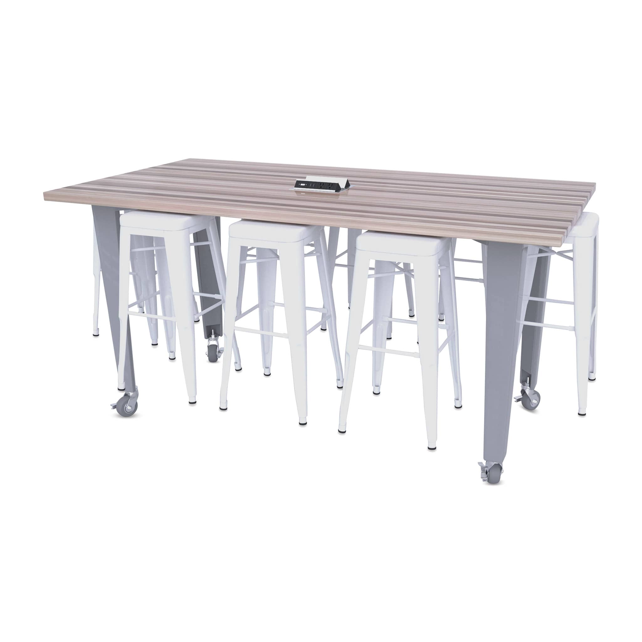 CEF Idea Island Work Table, 34" high with 8 white stools.