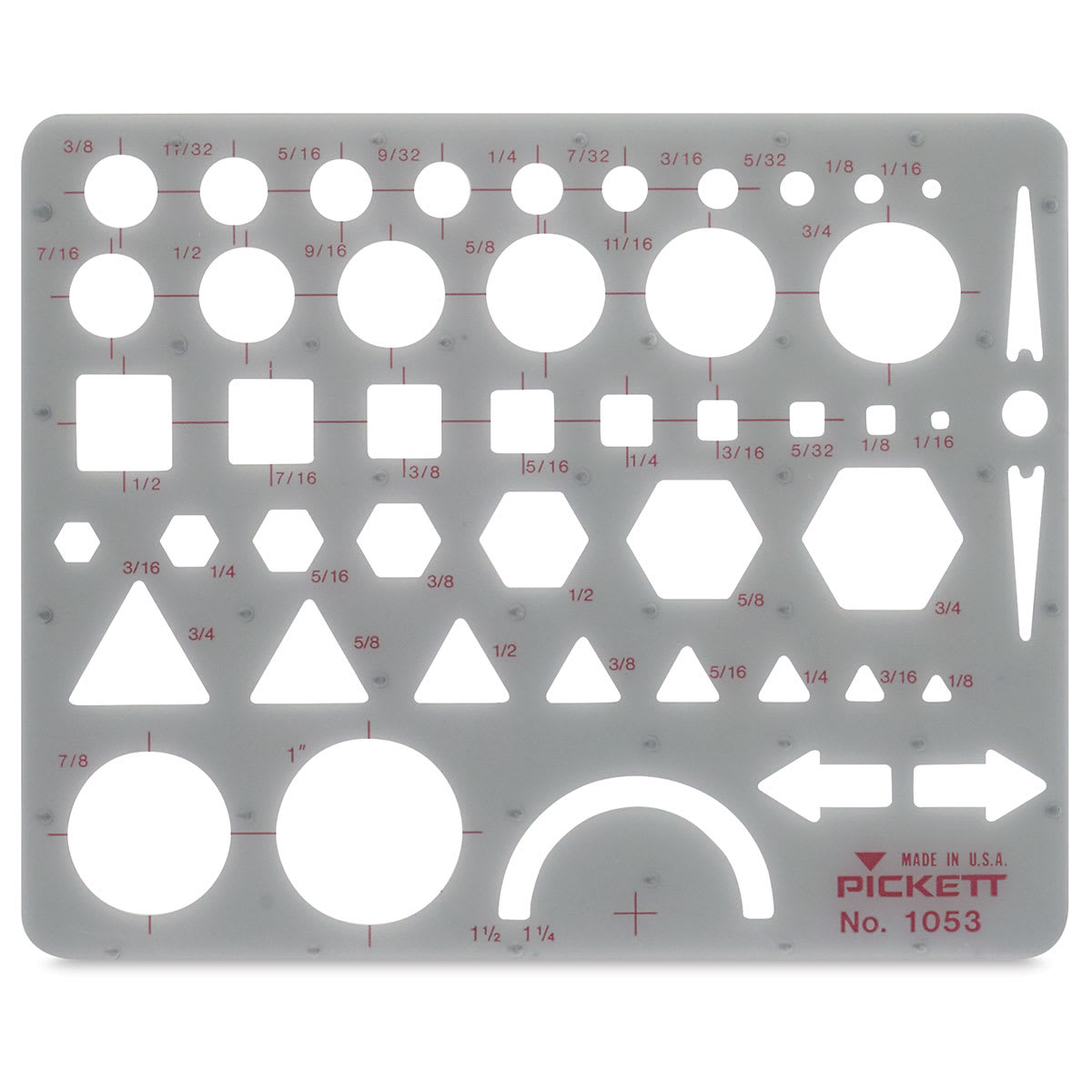 The 4-3/4" × 6" template features various sizes of circles, squares, hexagons, arrows, and triangles. The circles range in size from 1/16" to 1" in diameter.