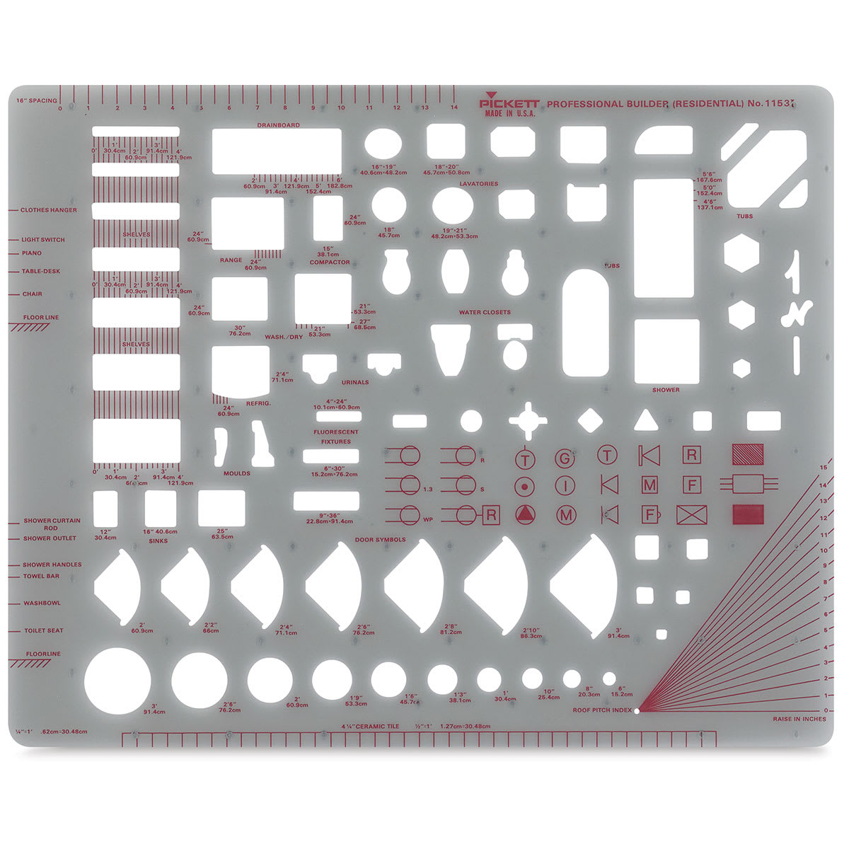 The 12" × 8" template includes architectural symbols used in designing kitchens and bathrooms. 1/4" = 1 ft scale.