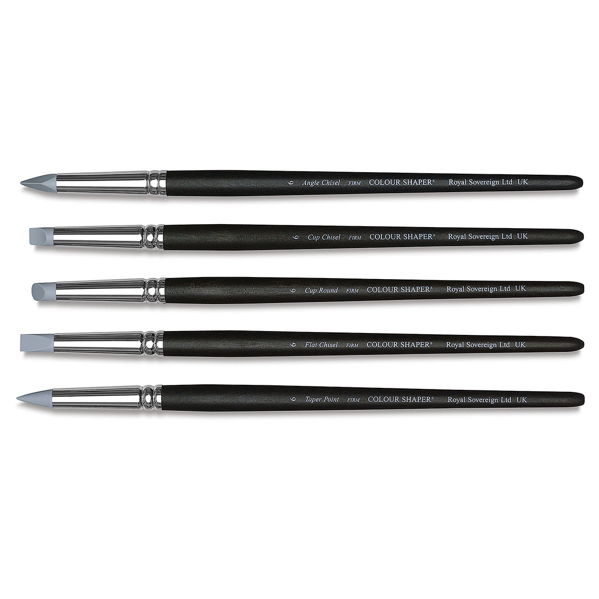 One of each firm tip in Size 6, including Taper Point, Cup Round, Cup Chisel, Flat Chisel, and Angle Chisel.
