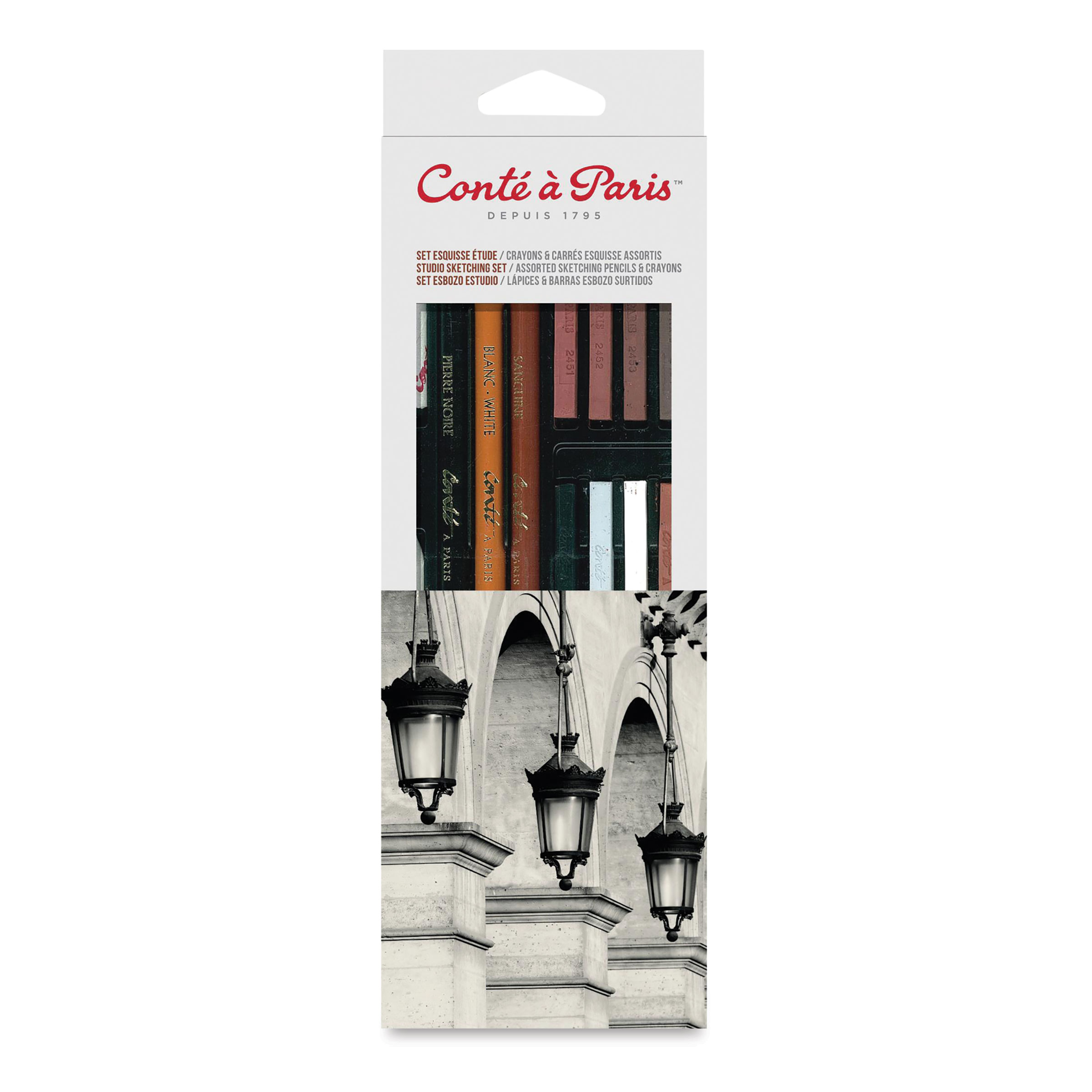 Includes three drawing pencils, one each of Sanguine, Pierre Noire 2B, and White; 12 sketching crayons, one each of Bistre, Sanguine, Sanguine XVIII, Sanguine Watteau, Sanguine Medicis, Grey, White 2B, and Pierre Noire HB, Pierre Noire B (x2), and 2B (x2); one stump, one tortillion, and one kneaded eraser.