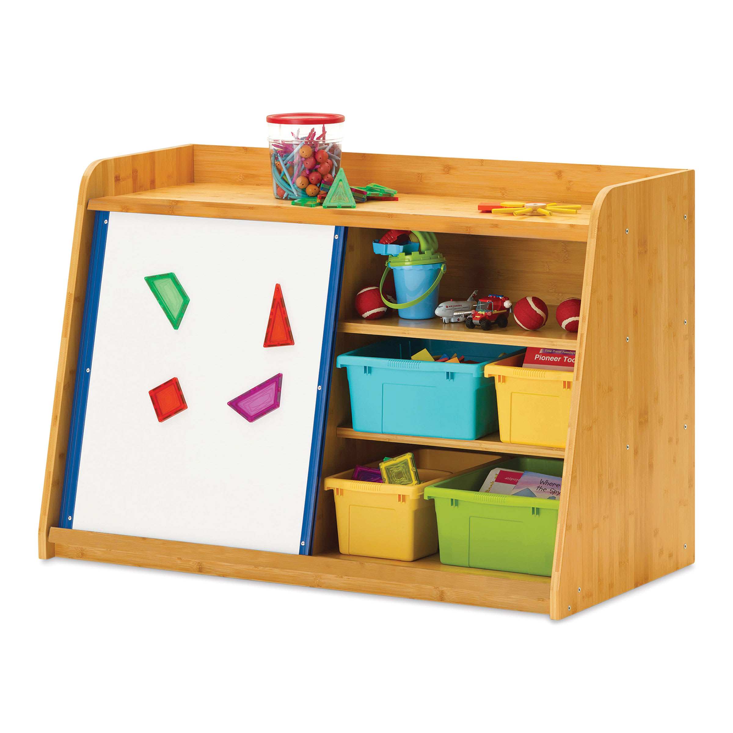 Includes a Write and Store Shelf with one whiteboard, four small divided tubs measuring 15 in (38 cm) L x 8-1/2 in (22 cm) W x 6 in (15 cm) D, and four large open tubs measuring 6 in (15 cm) H 12-1/2 in (32 cm) W and 15-3/4 (40 cm) D.