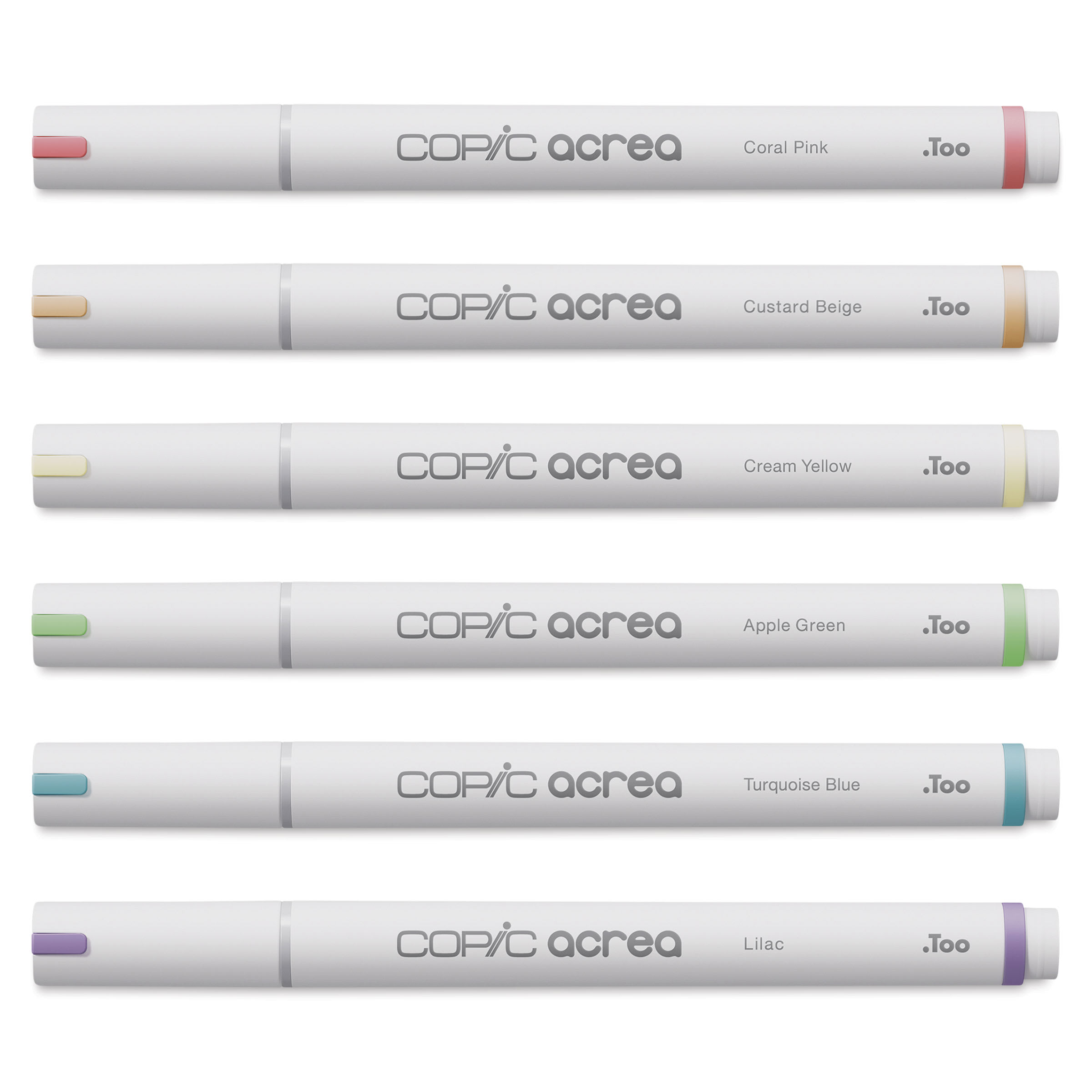 Includes Lilac, Coral Pink, Custard Beige, Cream Yellow, Apple Green, and Turquoise Blue.