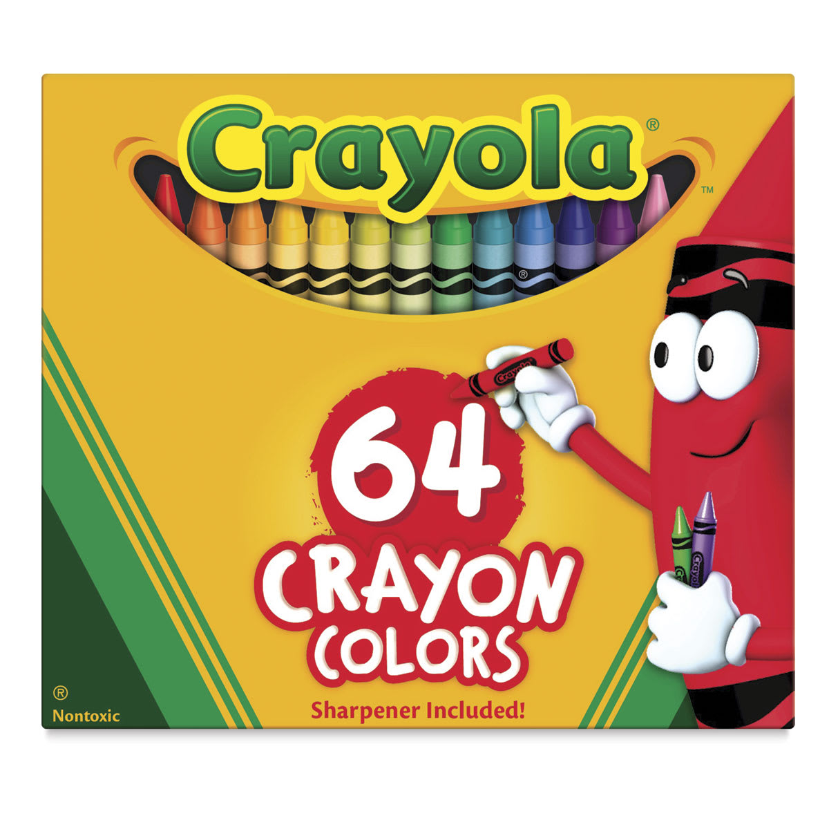 This hinge-top box contains 64 colors that include Red, Orange, Yellow, Blue, Green, Violet, Brown, Black, Blue-Green, Blue-Violet, Carnation Pink, Red-Orange, Red-Violet, White, Yellow-Green, Yellow-Orange, Scarlet, Green-Yellow, Cerulean, Bluetiful, Indigo, Violet-Red, Apricot, Gray, Purple Moutains Magesty, Cornflower, Sea Green, Granny Smith Apple, Olive Green, Spring Green, Lavender, Mauvelous, Goldenrod, Salmon, Sepia, Tumbleweed, Macaroni and Cheese, Burnt Sienna, Mahogany, Chestnut, Peach, Sky Blue, Cadet Blue, Melon, Tan, Wisteria, Timberwolf, Magenta, Bittersweet, Forest Green, Periwinkle, Wild Strawberry, Burnt Orange, Robin's Egg Blue, Orichid, Tickle Me Pink, Gold, Turquoise Blue, Plum, Brick Red, Asperagus, Pacific Blue, Silver, plus a built-in pencil sharpener.