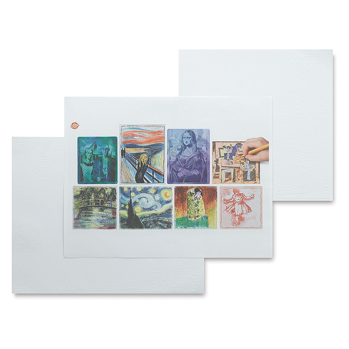 This set of 16 sheets includes two each of works by Leonardo Da Vinci, Vincent Van Gogh, Pablo Picasso, Claude Monet, Gustav Klimt, Grant Wood, Edward Munch, and Roy Lichtenstein. Sizes range from approximately 7½" Sqr to 8¼" × 11" (19 cm × 19 cm to 21 cm × 28 cm).