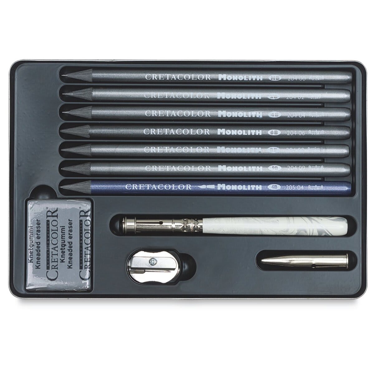 This set includes the following materials in a sleek tin metal case: Six Cretacolor Monolith pencils in different densities, a marbled monolith extender with cap, a watersoluble 9B Monolith pencil, a metal sharpener, and a kneaded eraser.