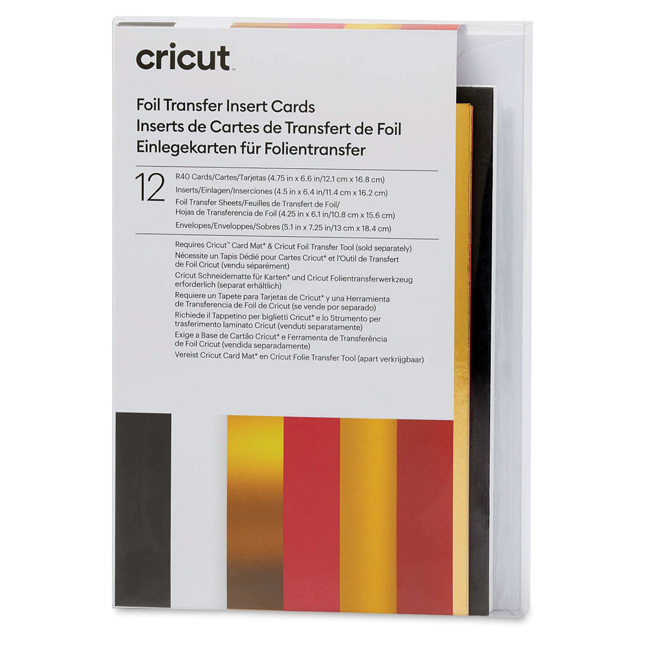 Includes 6 Black and 6 White cards, 6 Gold Metallic and 6 Burnt Red inserts, 6 Gold and 6 Red foil transfer sheets, and 12 White envelopes. The cards measure 6-5/8"L x 4-3/4"W, the inserts measure 6-3/8"L x 4-1/2"W, the foil transfer sheets measure 6-1/8"L x 4-1/4"W, and the envelopes measure 7-1/4"L x 5-1/8"W.