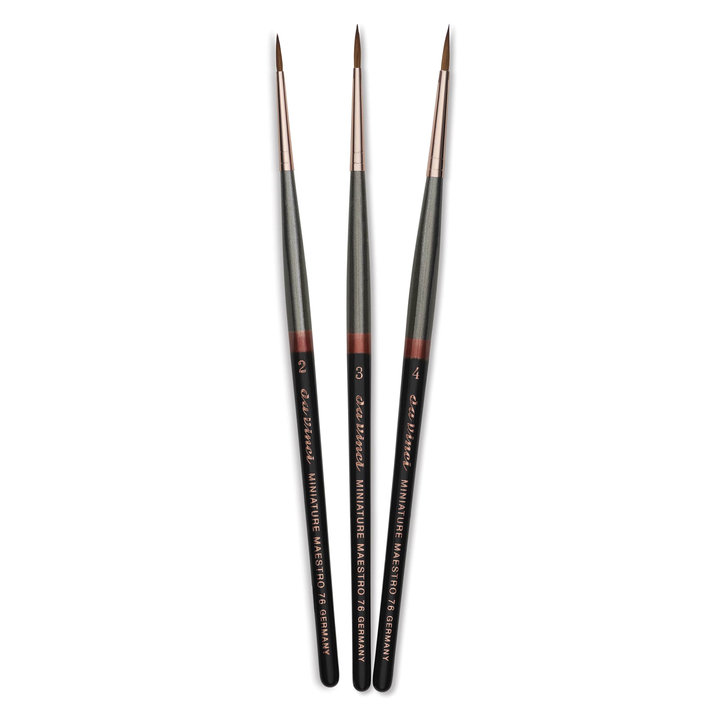 Includes a wooden brush holder and three Series 76 short Round Pointed brushes, one each in size 2, size 3, and size 4.
