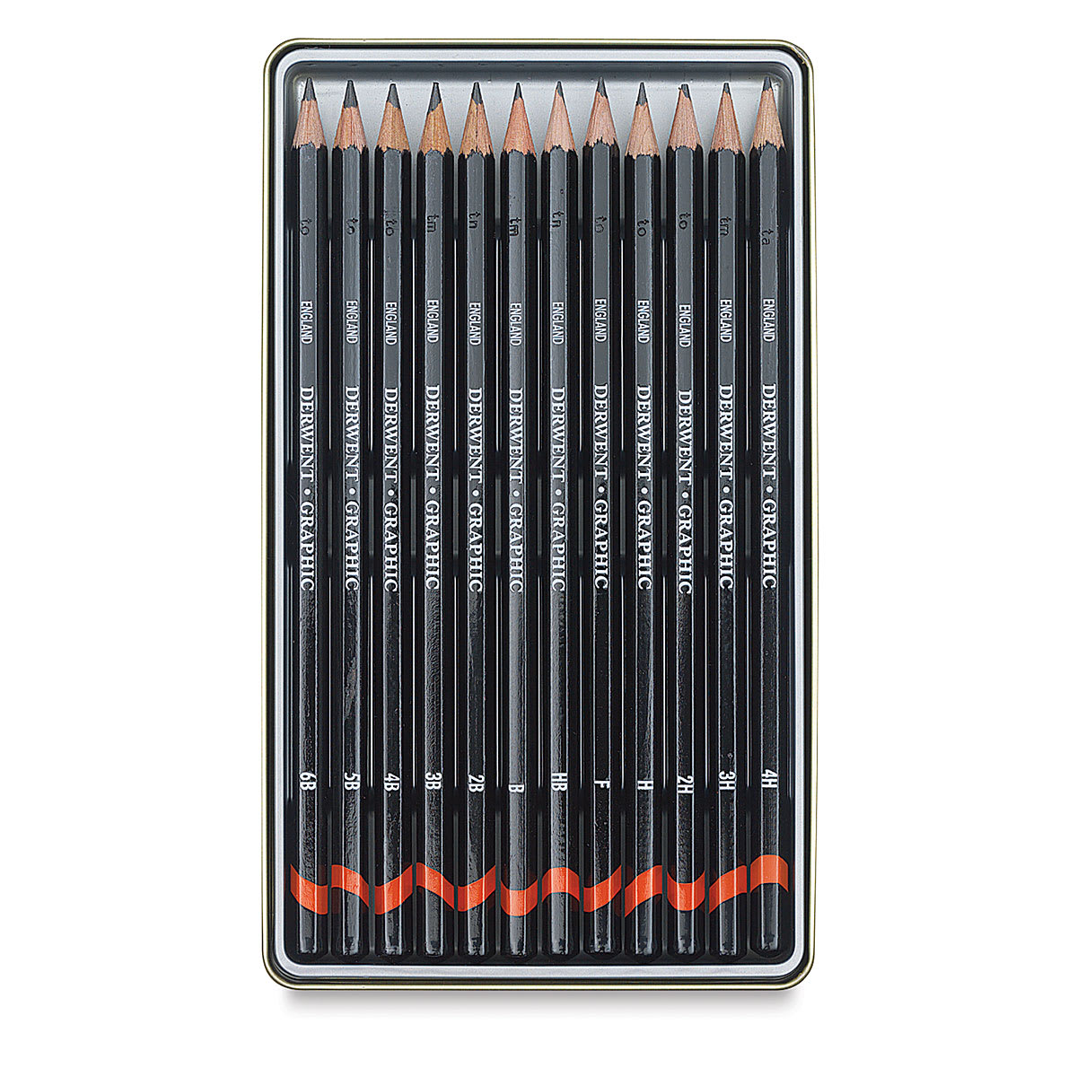A range of 12 medium pencils. Includes one each of 6B, 5B, 4B, 3B, 2B, B, HB, F, H, 2H, 3H, and 4H.