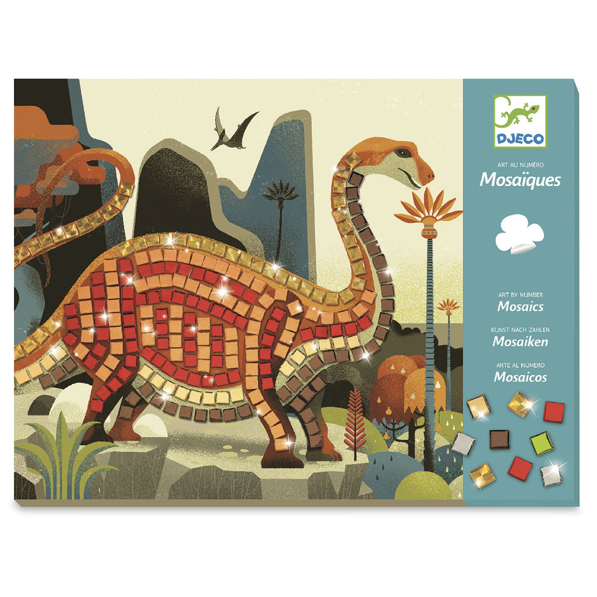 This kit includes two dinosaur themed picture boards, seven sheets of adhesive-backed foam mosaic tiles, and instructions. Recommended for ages 4–8.