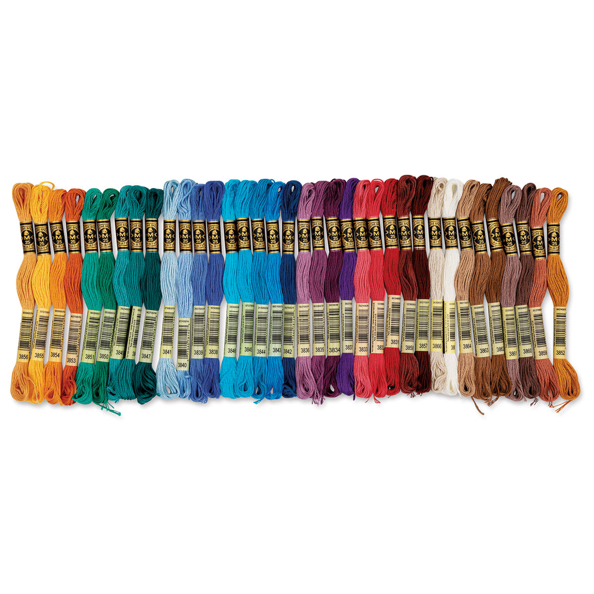 Includes one skein each of Dark Raspberry, Medium Raspberry, Light Raspberry, Dark Grape, Medium Grape, Light Grape, Ultra Dark Lavender, Dark Lavender Blue, Medium Lavender Blue, Light Lavender Blue, Pale Baby Blue, Dark Wedgewood, Electric Blue, Dark Bright Turquoise, Medium Bright Turquoise, Light Bright Turquoise, Dark Teal Green, Medium Teal Green, Light Teal Green, Dark Bright Green, Light Bright Green, Very Dark Straw, Dark Autumn Gold, Medium Autumn Gold, Light Autumn Gold, Ultra Very Light Mahogany, Dark Rosewood, Medium Rosewood, Light Rosewood, Cocoa, Light Cocoa, Dark Mocha Beige, Medium Mocha Beige, Light Mocha Beige, Ultra Very Light Mocha Brown, and Winter White.