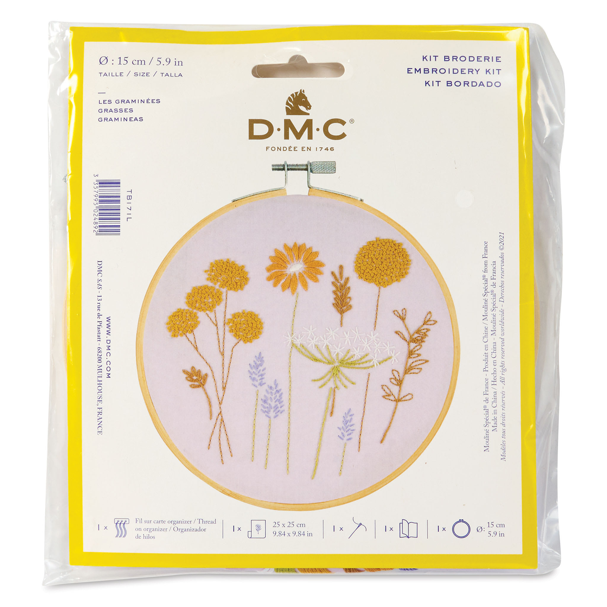 This kit includes pink fabric and uses the following stitches: French knot, satin stitch, back stitch, throw stitch, chain stitch, stem stitch, and loop stitch.