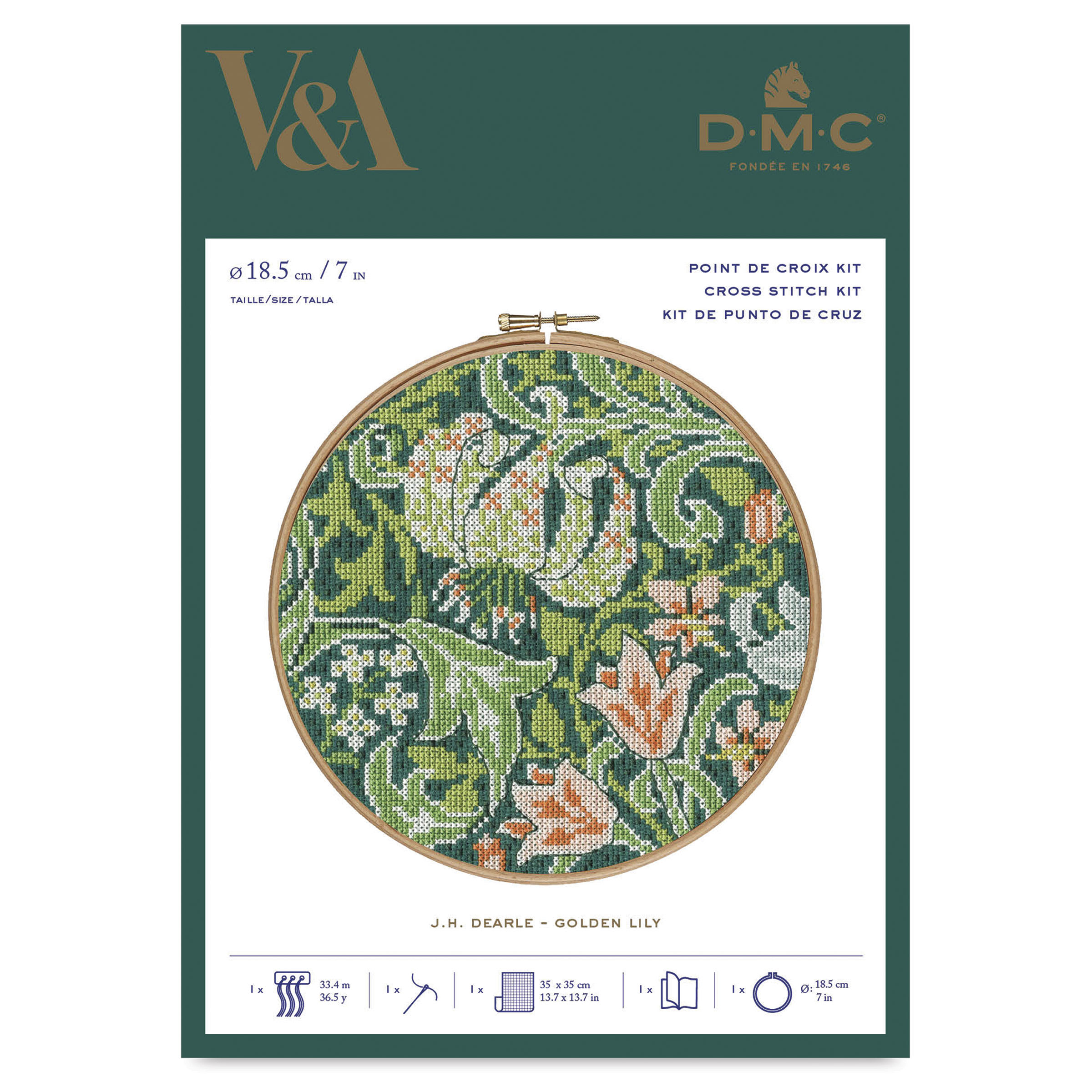 Includes one piece of 14-count 100% cotton Aida fabric, one embroidery hoop (7.3”), one needle, color-coordinated DMC Mouliné Spécial thread on organizer, a cross stitch chart, and full instructions.