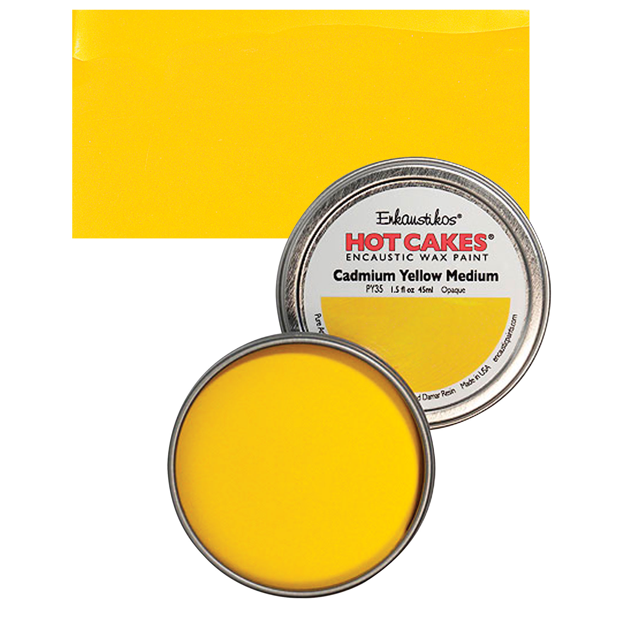Cadmium Yellow is brilliant, dense, and opaque, with good tinting strength and very high hiding power. It is the artist's principal bright yellow and is available in light, medium, and dark shades. The deeper shades appear deep orange and have the greatest tinting strength. It is slow-drying in oil form and is used in both oil and watercolor form. A clean Cadmium Orange is created when Cadmium Yellow is mixed with Cadmium Red. Hues vary by brand. Cadmium pigments have been partially replaced by azo pigments, which are similar in lightfastness to the cadmium colors, cheaper, and non-toxic. Cadmium Yellow is usually available in a pure grade, or in a cadmium-barium mix. This mix has the same permanence with a lower tinting strength.