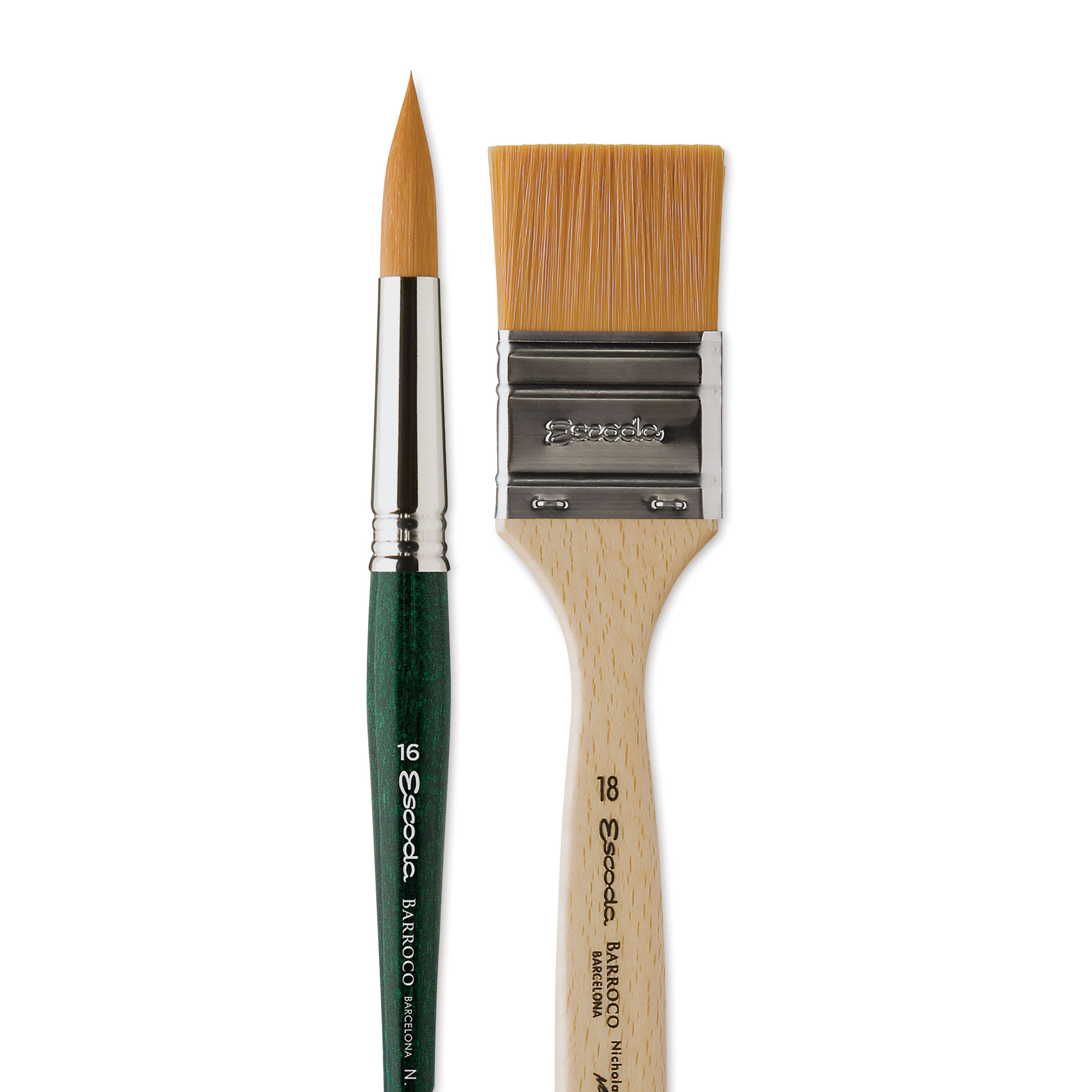 Simmons's Escoda Signature Brush Set 2 includes one Size 16 Barroco Round and one Size 18 Barroco Mottler.