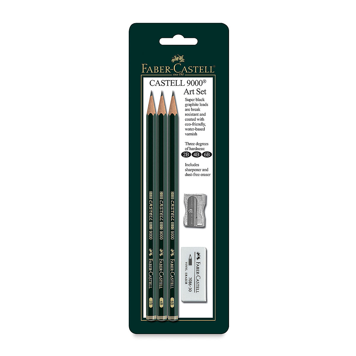 This set includes one each of 2B, 4B, 6B, a latex-free eraser, and sharpener.