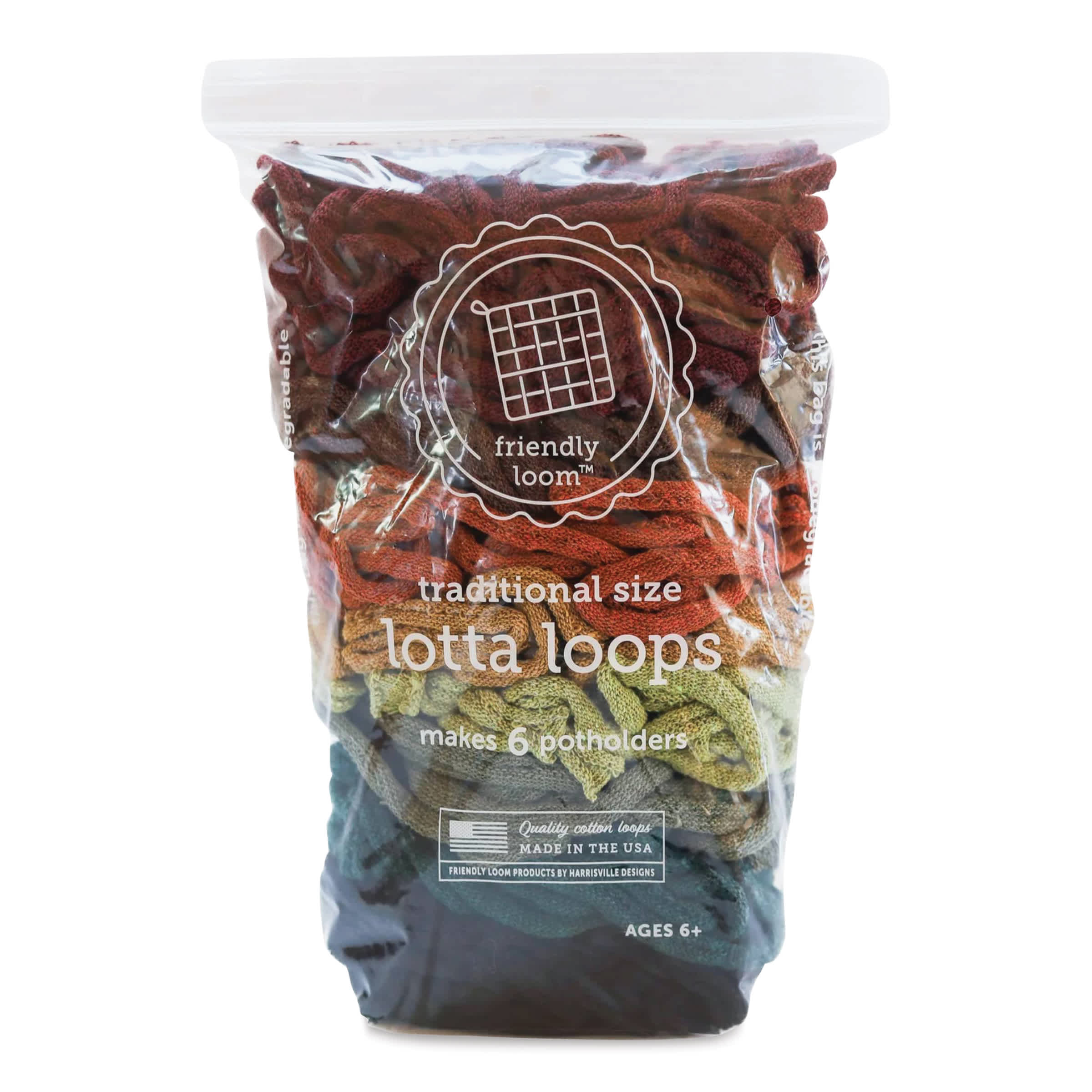 Includes loops for 6 potholders in various colors including Chocolate, Burgundy, Spice, Ochre, Leaf, Willow, and Pine.