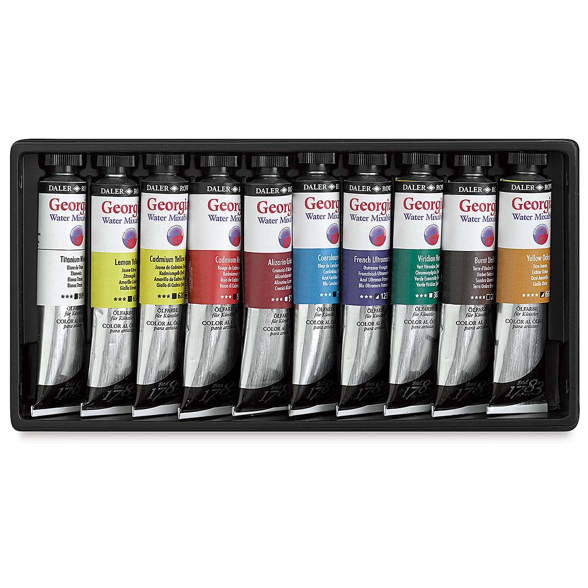 A great introduction to the advantages of Georgian Water Mixable Oils, this set includes 0.67 oz (20 ml) tubes of Crimson Alizarin Hue, Burnt Umber, Cadmium Red Hue, Cadmium Yellow Hue, Coeruleum Hue, French Ultramarine, Lemon Yellow, Titanium White, Viridian Hue, and Yellow Ochre.