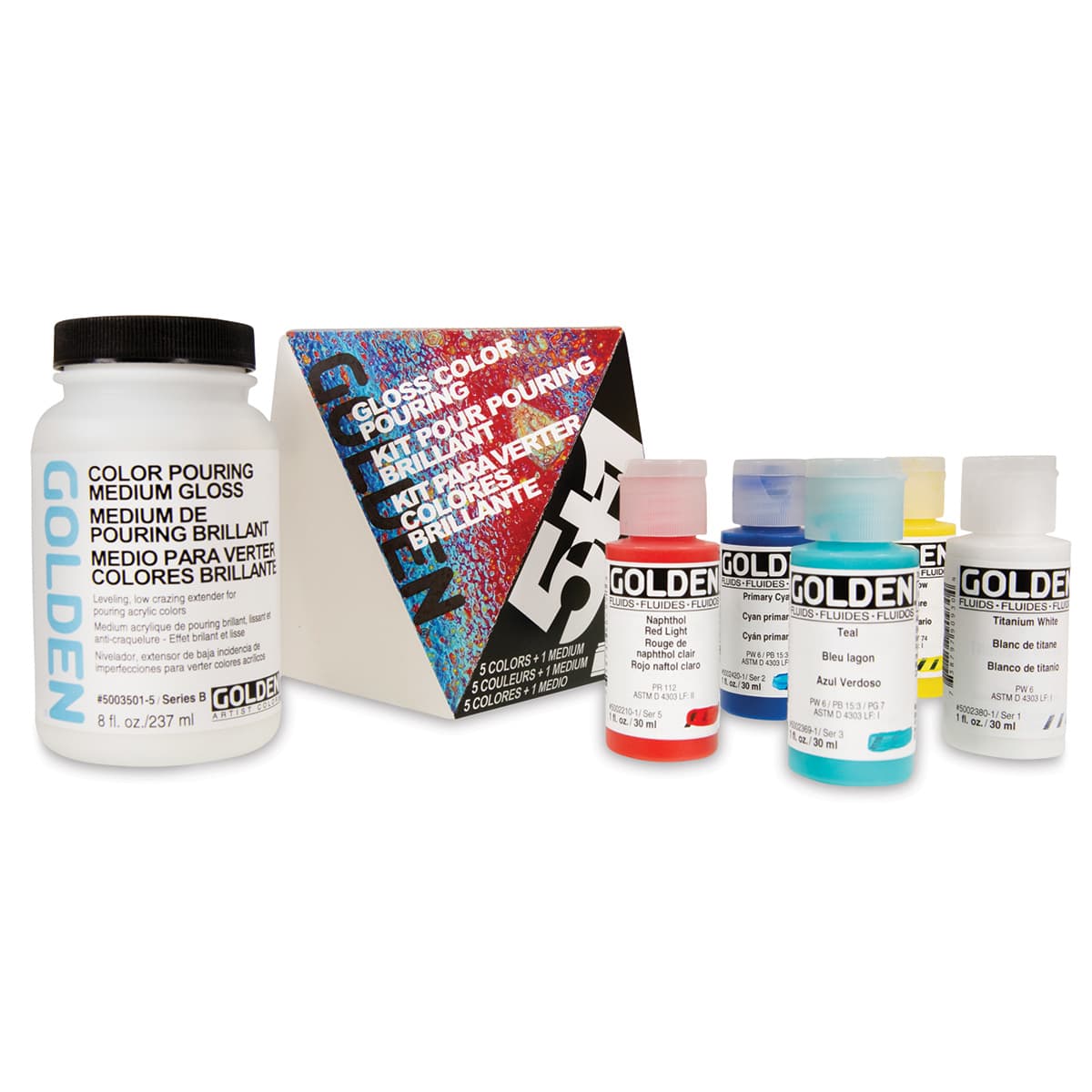 Includes one 8 oz (237 ml) jar of Color Pouring Medium Gloss, five 1 oz (30 ml) Fluid Acrylic colors in Titanium White, Naphthol Red Light, Primary Yellow, Teal, and Primary Cyan, and a plastic pouring bowl.