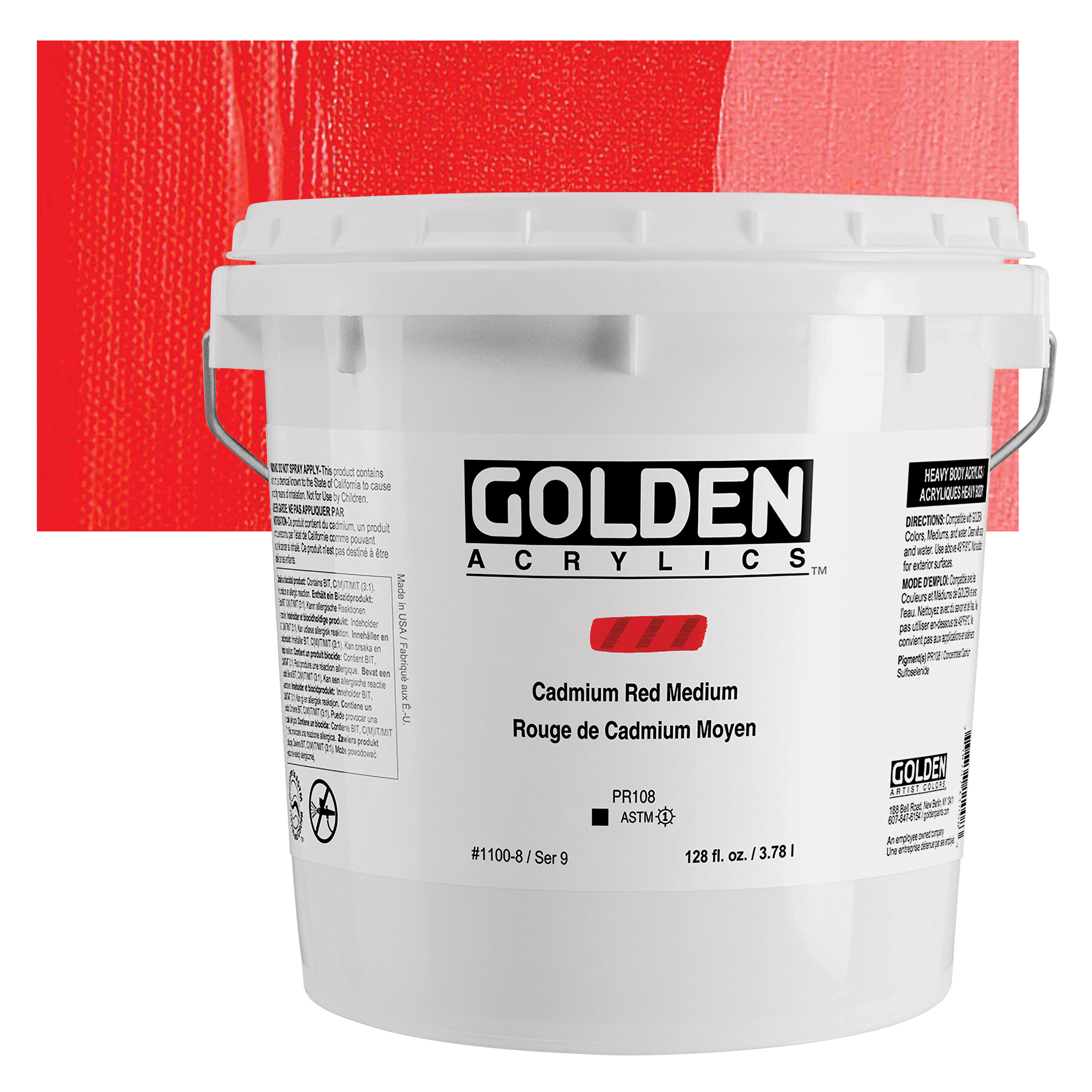 Cadmium Red is a bright, warm red that ranges in shade from orange-red to maroon and is available in light, medium, and dark versions. It is strong and opaque, with good tinting strength. Cadmium Red dries slowly. It grays down when mixed with white, mixes well with blues to create a range of browns, and mixes well with Cadmium Yellow to create a strong orange. It also works well in neutral mixes. Cadmium pigments have been partially replaced by azo pigments, which are similar in lightfastness to the cadmium colors, cheaper, and non-toxic. Hues vary by brand. Cadmium Red is usually available in either a pure grade or a cadmium-barium mix. The cadmium-barium mix has the same permanence as pure Cadmium Red, but it has a lower tinting strength.