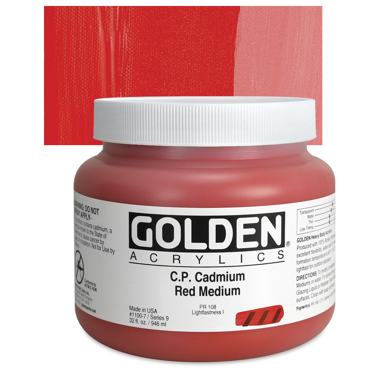 Cadmium Red is a bright, warm red that ranges in shade from orange-red to maroon and is available in light, medium, and dark versions. It is strong and opaque, with good tinting strength. Cadmium Red dries slowly. It grays down when mixed with white, mixes well with blues to create a range of browns, and mixes well with Cadmium Yellow to create a strong orange. It also works well in neutral mixes. Cadmium pigments have been partially replaced by azo pigments, which are similar in lightfastness to the cadmium colors, cheaper, and non-toxic. Hues vary by brand. Cadmium Red is usually available in either a pure grade or a cadmium-barium mix. The cadmium-barium mix has the same permanence as pure Cadmium Red, but it has a lower tinting strength.