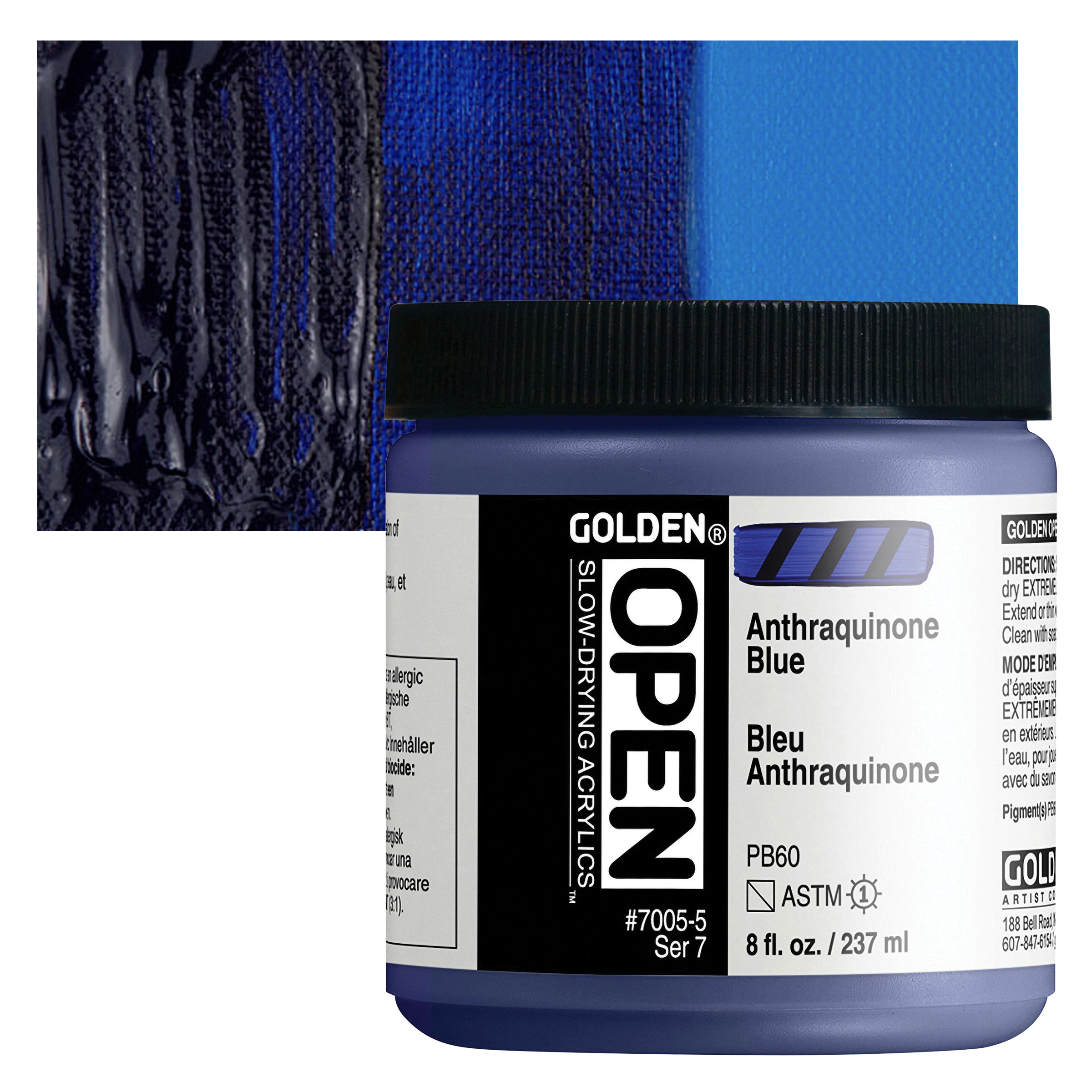 Indanthrene Blue is a clear, clean, deep blue organic pigment. It has moderate to high tinting strength and is not as overpowering as Phthalo Blue. Hansa Yellow Deep, Benzimidazolone Orange, and Raw Umber are its best mixing complements.
