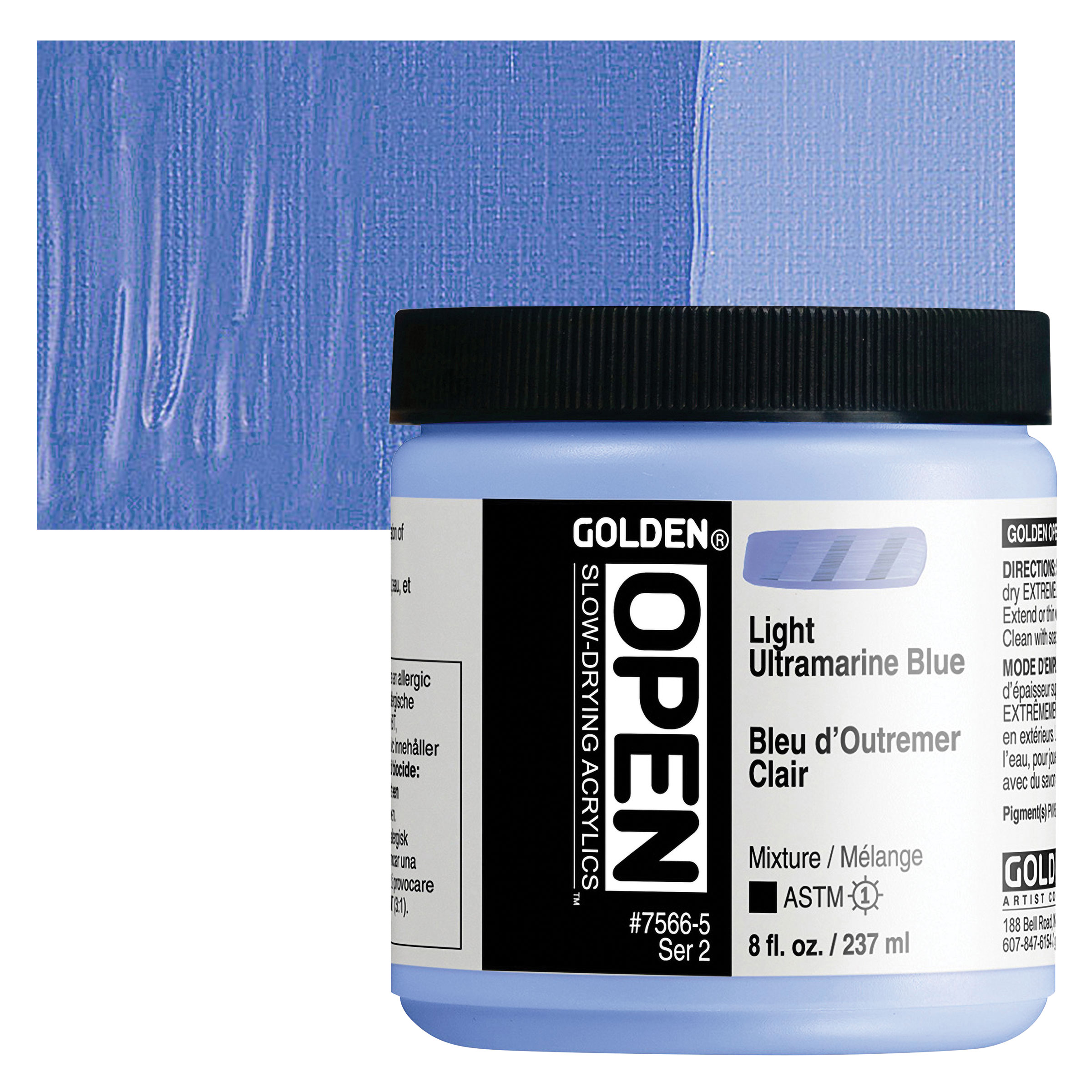Ultramarine is the standard warm blue, a brilliant blue pigment that has the most purple and least green in its undertone. It has a moderate to high tinting strength and a beautiful transparency. Synthetic Ultramarine is not as vivid a blue as natural Ultramarine. Ultramarine dries slowly in oil and tends to produce clean, though granular, washes in watercolor. French Ultramarine mixes well with Alizarin colors in oil and watercolor form to create a range of purples and violets. It can dull when mixed with white in acrylic form, but mixes well with other colors. The shade varies based on manufacturer. Considered a great color for glazes, it is not suitable for frescoing.