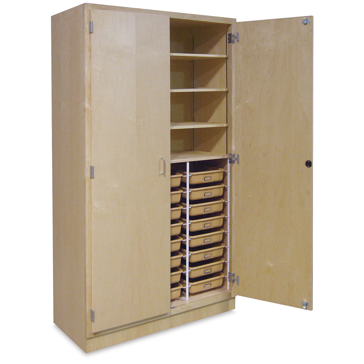 The 24-tote cabinet has three adjustable upper shelves. The tote trays (included) are constructed of high-impact polystyrene and measure approximately 3½"H × 12½"W × 18"D inside. Label holders on the outside of the trays help keep things even more organized. Two large cupboard doors are fitted with heavy-duty hinges and a cylinder lock for long-lasting durability and security.