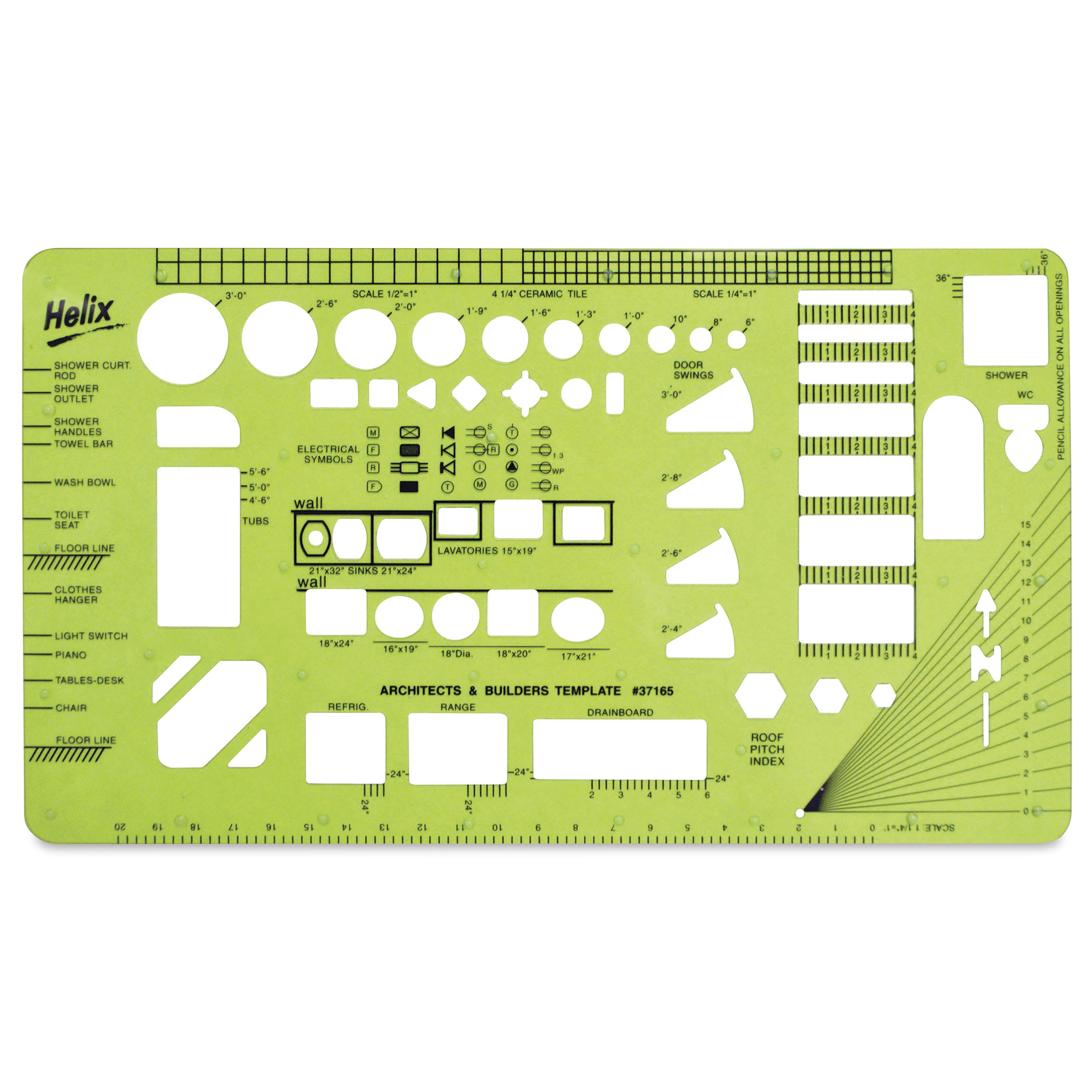 The template features 51 stencils, including basic symbols used by contractors, builders, and architects, and title layout scale and elevation WC view. It measures 5.67" W x 10.6" H.