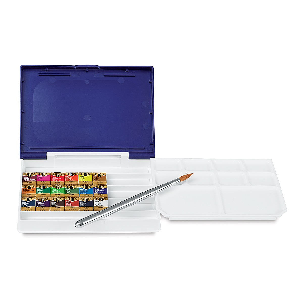 This set includes Brilliant Orange, Burnt Sienna, Burnt Umber, Chinese White, Lemon Yellow, Payne's Grey, Prussian Blue, Sap Green, Ultramarine Deep, Viridian Hue, Yellow Ochre, Dioxazine Violet, Indian Yellow, Opera, Cadmium Green Pale, Permanent Alizarin Crimson, Cadmium Red Light, and Cerulean Blue, along with a travel brush in a durable, high-quality plastic case.