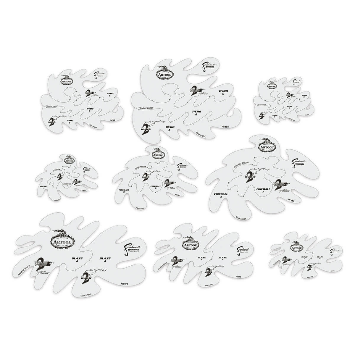 This set includes three templates — Blaze, Fireball, and Pyro. Cut the tiny connecting tabs on each to reveal 21 different positive/negative shapes. All templates measure approximately 8" × 11".